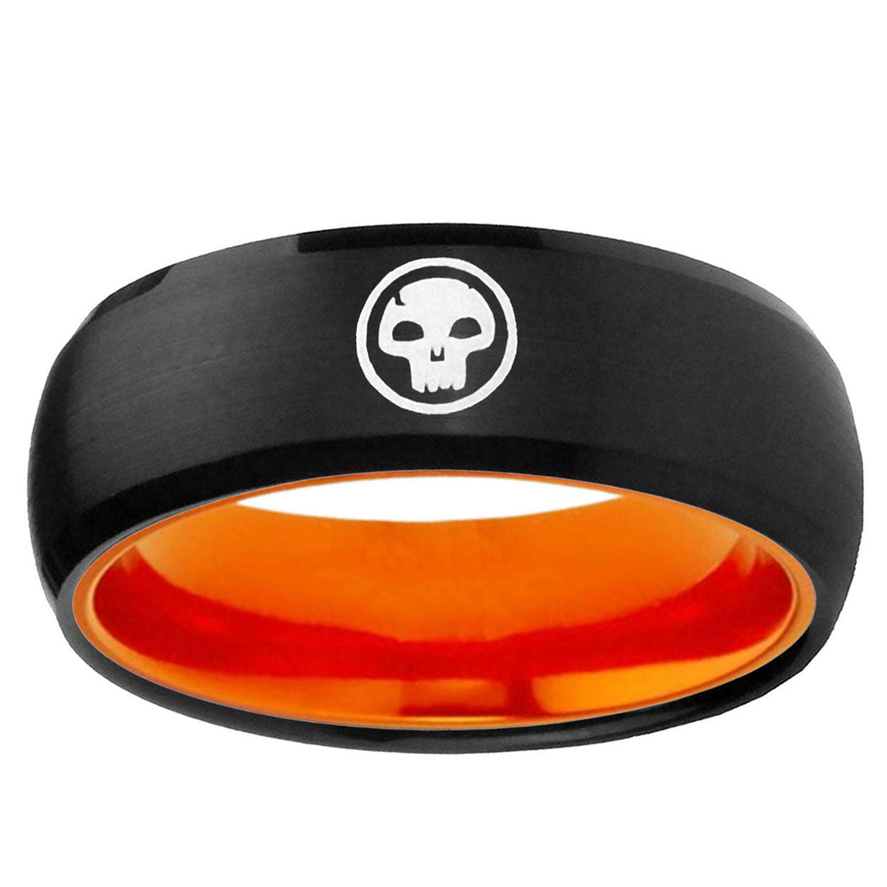Intruding 8mm Skull Dome Black And Orange Tungsten Carbide Wedding Engraving Ring . Offer in men wedding band in 8mm band width Black And Orange plated finished from size 7 to 14