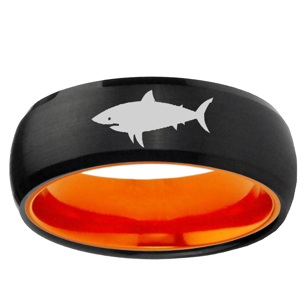 Intruding 8mm Shark Dome Black And Orange Tungsten Carbide Men's Wedding Ring . Offer in men wedding band in 8mm band width Black And Orange plated finished from size 7 to 14