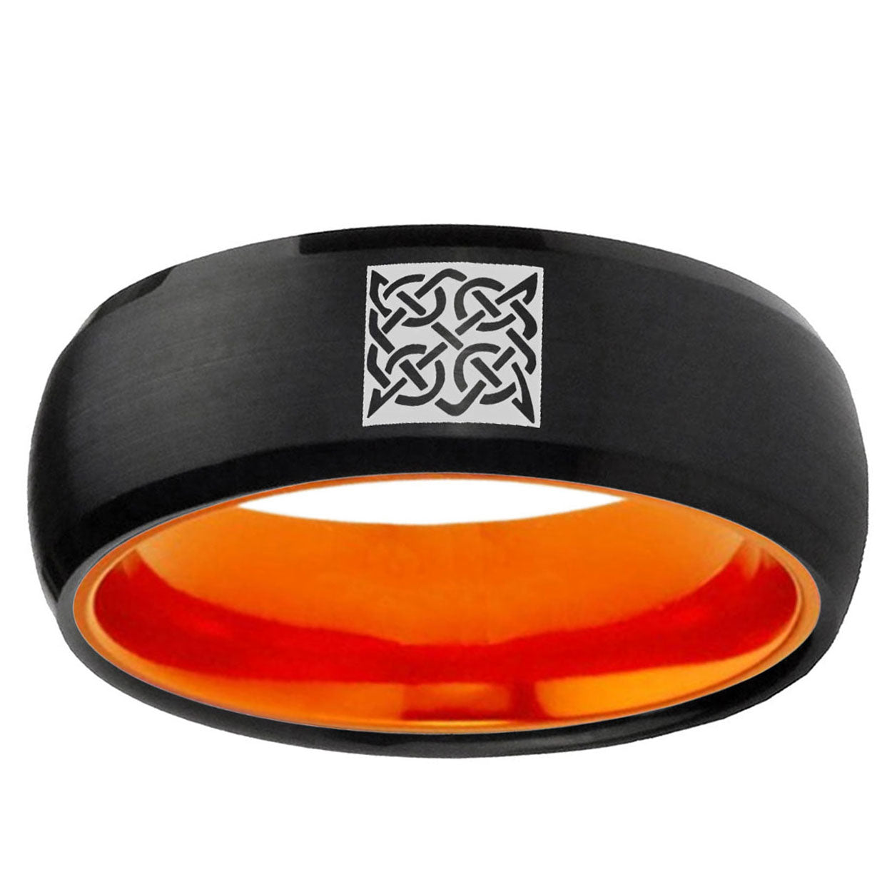 Intruding 8mm Celtic Design Dome Black And Orange Tungsten Carbide Personalized Ring . Offer in men wedding band in 8mm band width Black And Orange plated finished from size 7 to 14