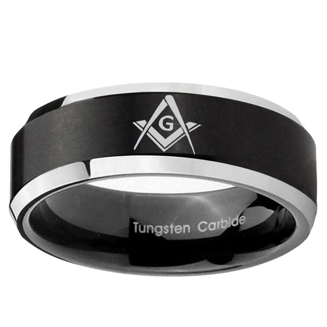 Intruding 5, 8mm Freemason Masonic Beveled Edges Brush Black 2 Tone Tungsten Mens Bands Ring . Offer in both 5mm and 8mm band width brushed black plated 2 tone finished from size 4 to 14