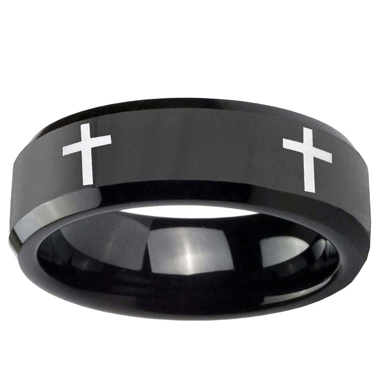 Celebrate faith with the 10mm Crosses Beveled Edges Black Tungsten Carbide Wedding Engraving Ring. This black tungsten ring with Crosses design is perfect for weddings and custom engravings.