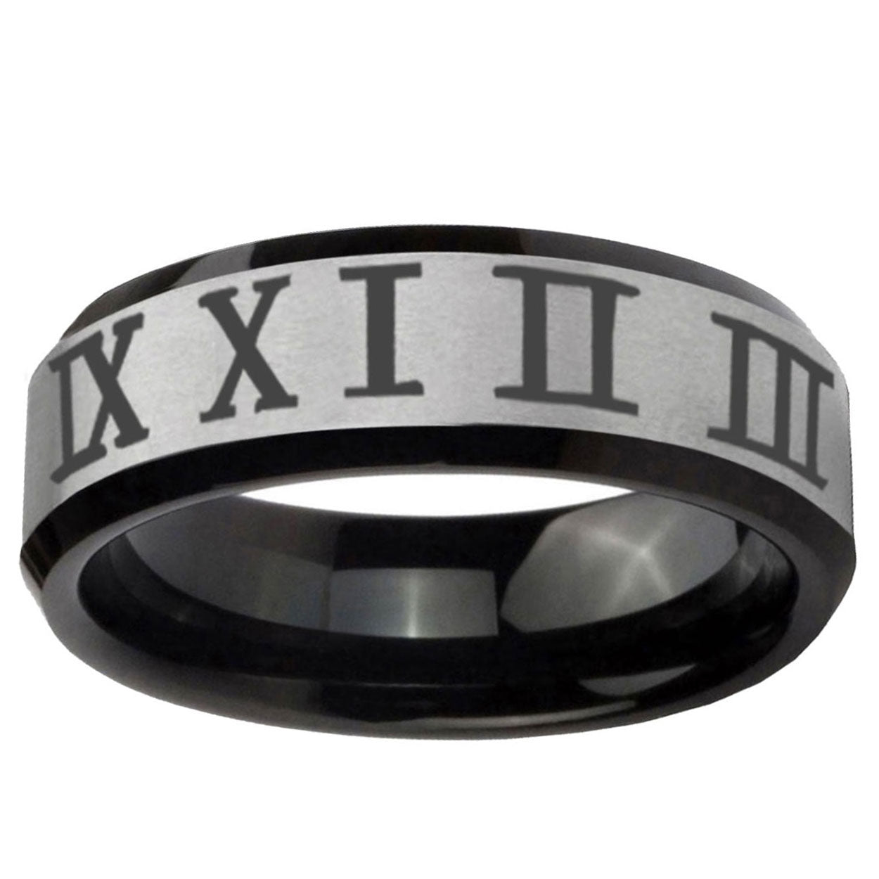 Intruding 5, 8mm Roman Numeral Beveled Edges Brush Black 2 Tone Tungsten Mens Bands Ring . Offer in both 5mm and 8mm band width brush black 2 tone finished from size 4 to 14