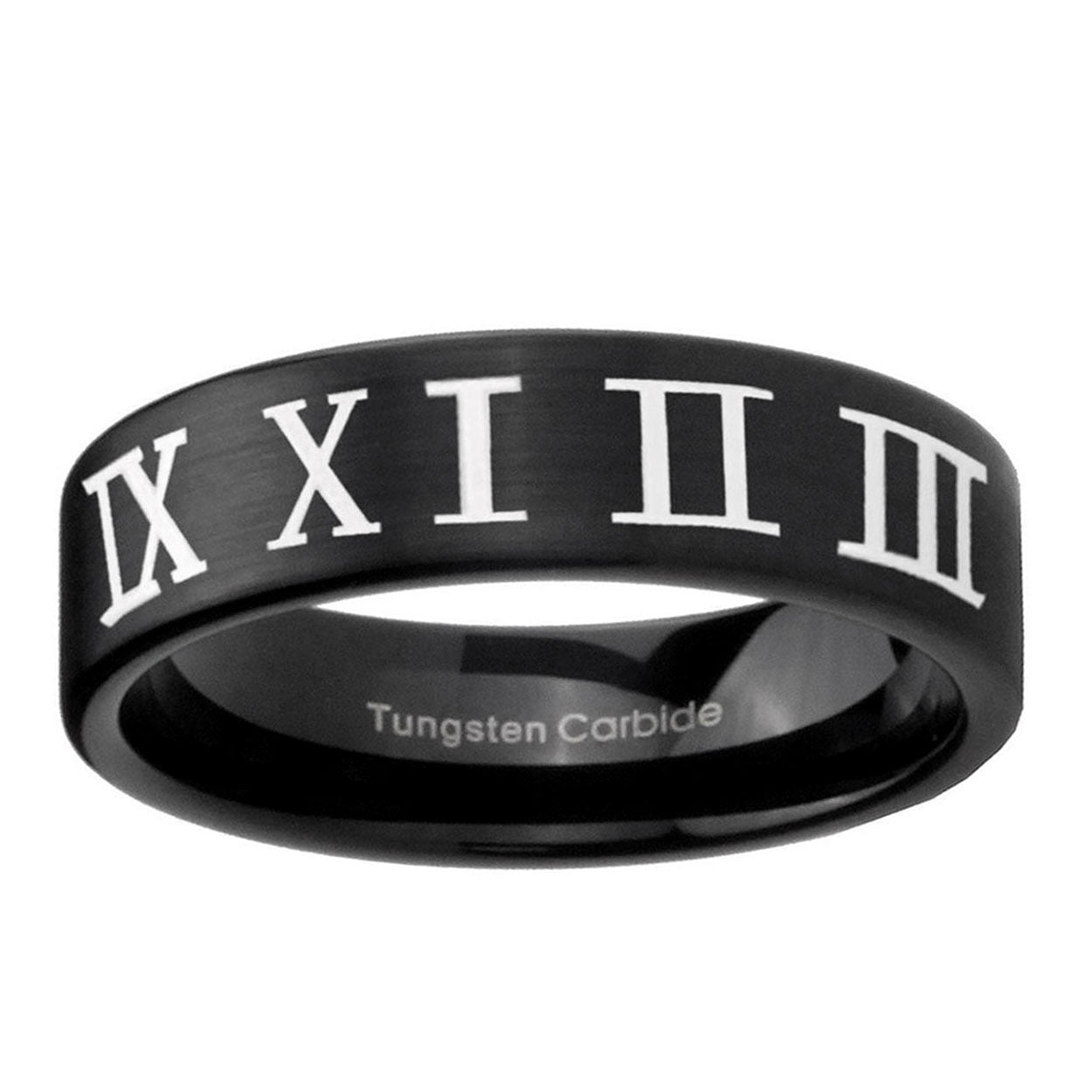 Intruding 6, 8mm Roman Numeral Pipe Cut Brush Black Tungsten Carbide Wedding Engraving Ring . Offer in both 6mm and 8mm band width brushed black plated finished from size 5 to 14