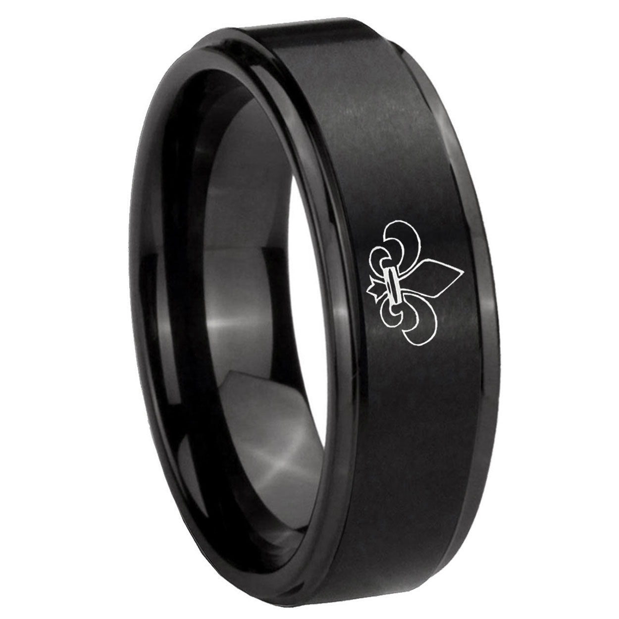 Make a promise with the 10mm Fleur-De-Lis Step Edges Brush Black Tungsten Men's Promise Rings. This brushed black ring with step edges and Fleur-De-Lis design is ideal for commitments.