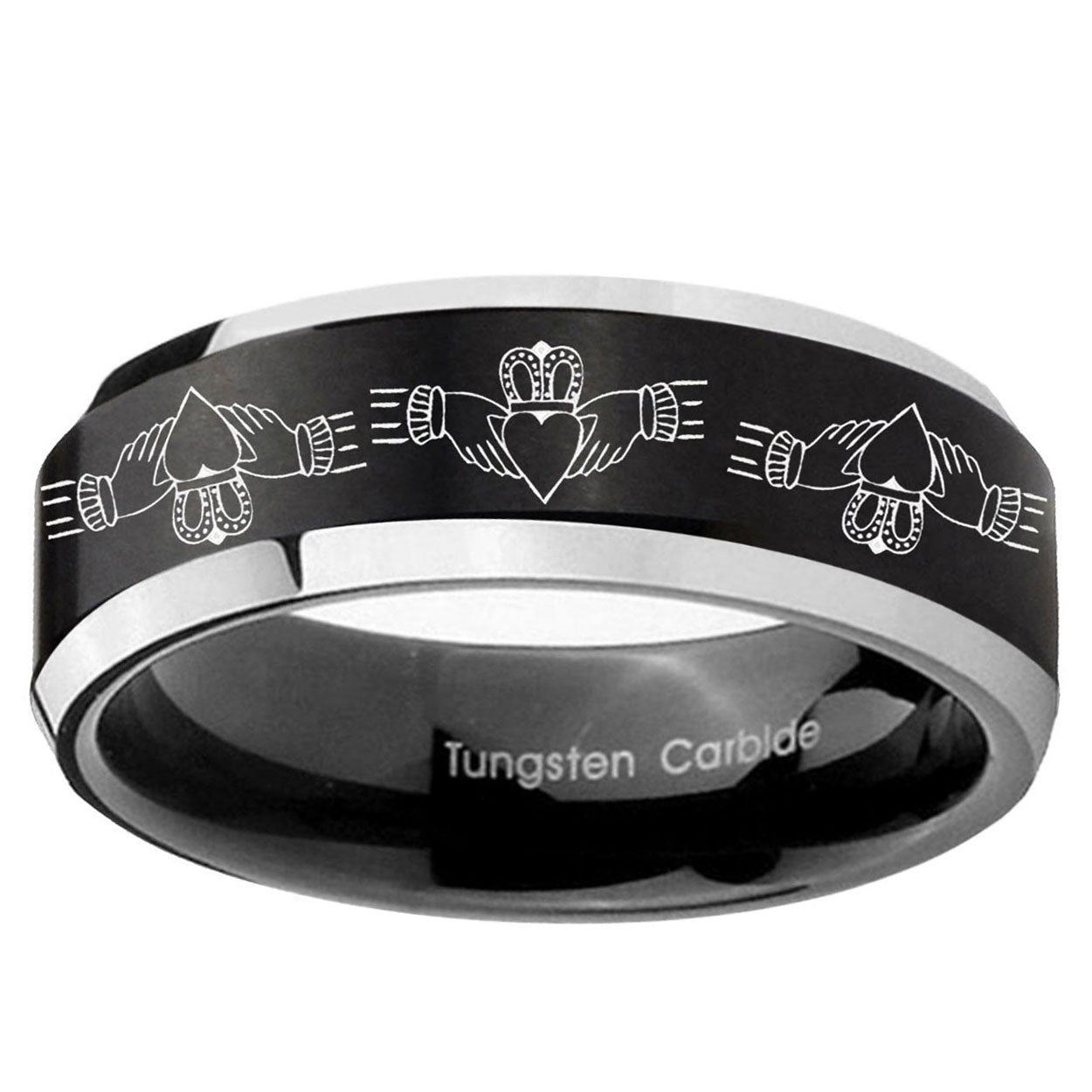 Intruding 5, 8mm Irish Claddagh Beveled Edges Brush Black 2 Tone Tungsten Men's Wedding Ring . Offer in both 5mm and 8mm band width brushed black plated 2 tone finished from size 4 to 14