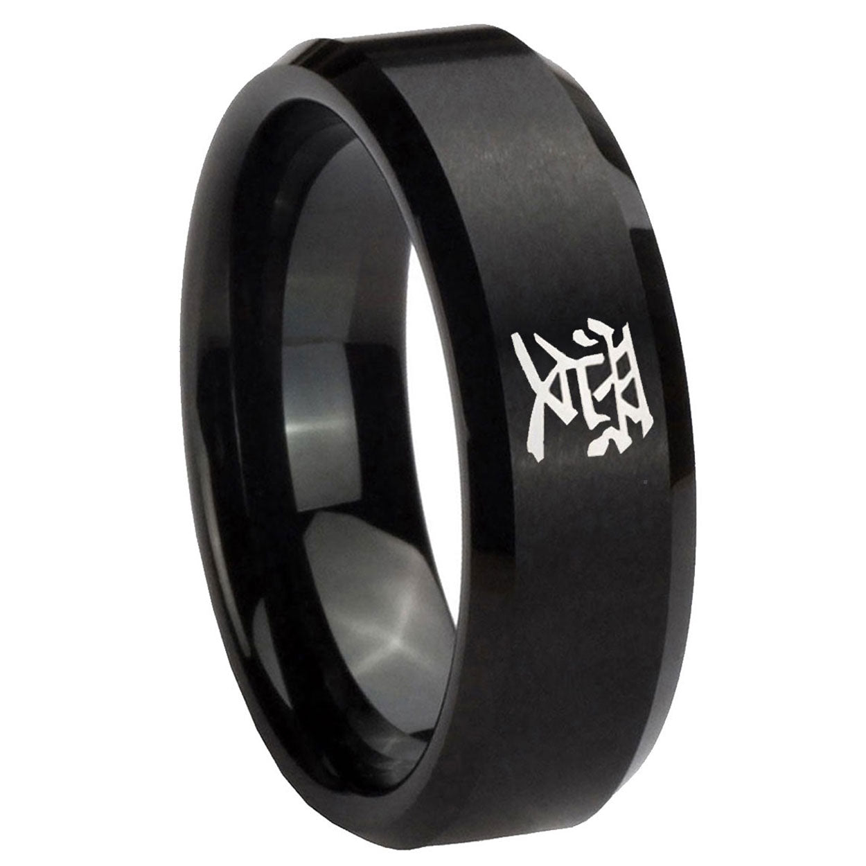 Personalize the 10mm Kanji Love Beveled Edges Brush Black Tungsten Carbide Mens Ring Engraved. This brushed black tungsten ring with Kanji Love design is perfect for custom engravings.