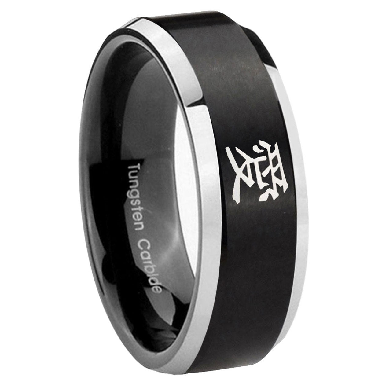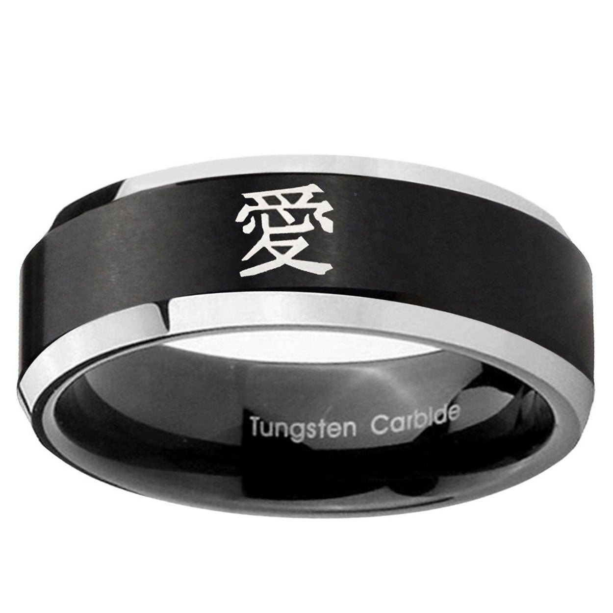5, 8mm Kanji Love Beveled Edges Brush Black 2 Tone Tungsten Wedding Engraving Ring