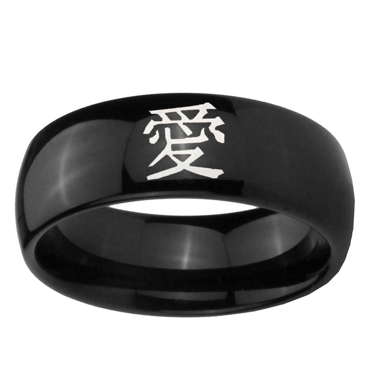 Intruding 5, 8mm Kanji Love Dome Black Tungsten Carbide Wedding Engraving Ring . Offer in both 5mm and 8mm band width polished black plated finished from size 4 to 14