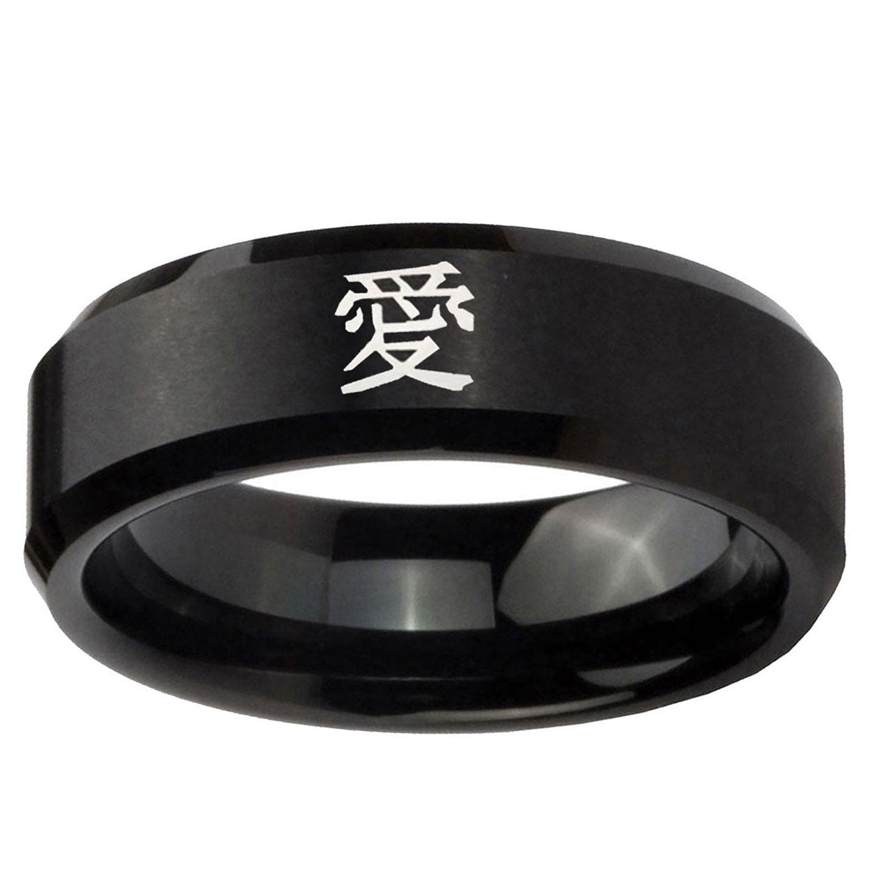 Intruding 5, 8mm Kanji Love Beveled Edges Brush Black Tungsten Carbide Men's Ring . Offer in both 5mm and 8mm band width brushed black plated finished from size 4 to 14