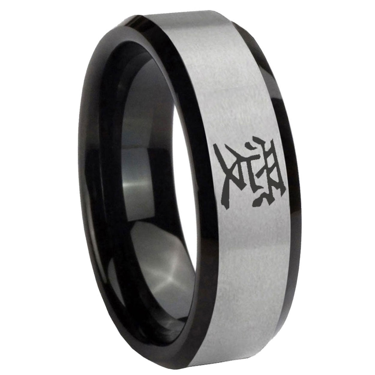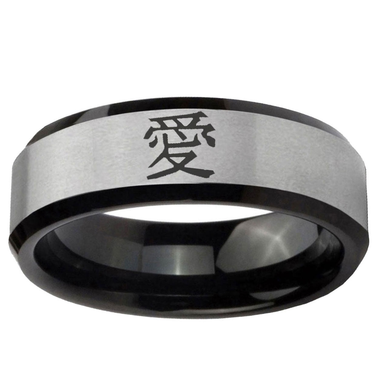 Intruding 5, 8mm Kanji Love Beveled Edges Brush Black 2 Tone Tungsten Men's Wedding Band . Offer in both 5mm and 8mm band width brush black 2 tone finished from size 4 to 14