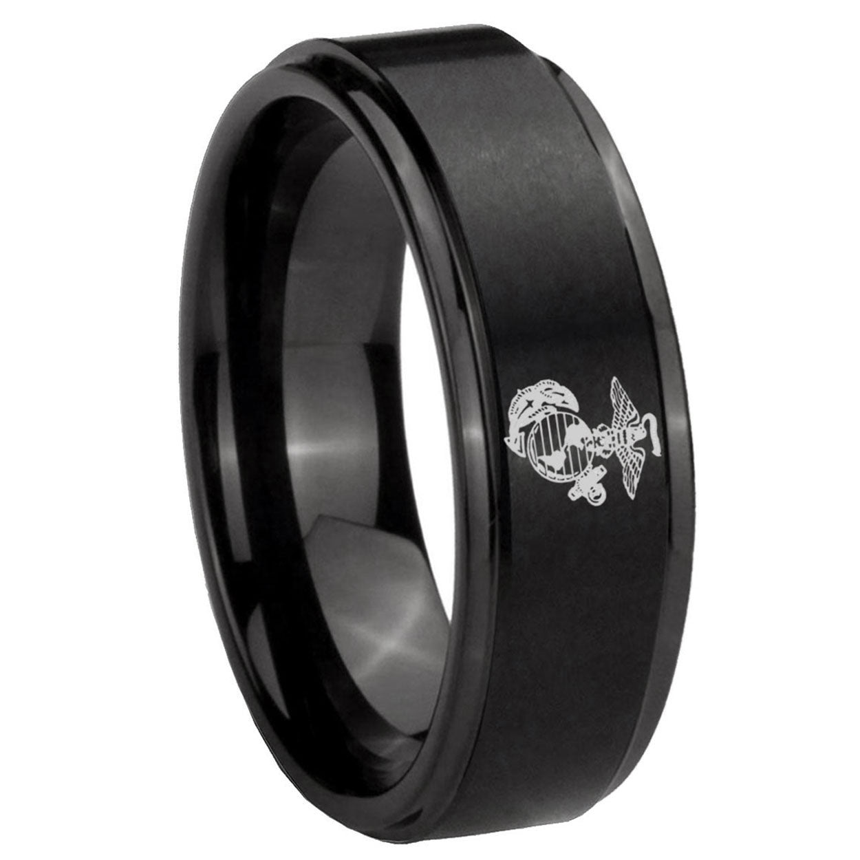 Intruding 5, 8mm Marine Step Edges Brush Black Tungsten Carbide Men's Engagement Ring . Offer in both 5mm and 8mm band width brush black plated finished from size 4 to 14