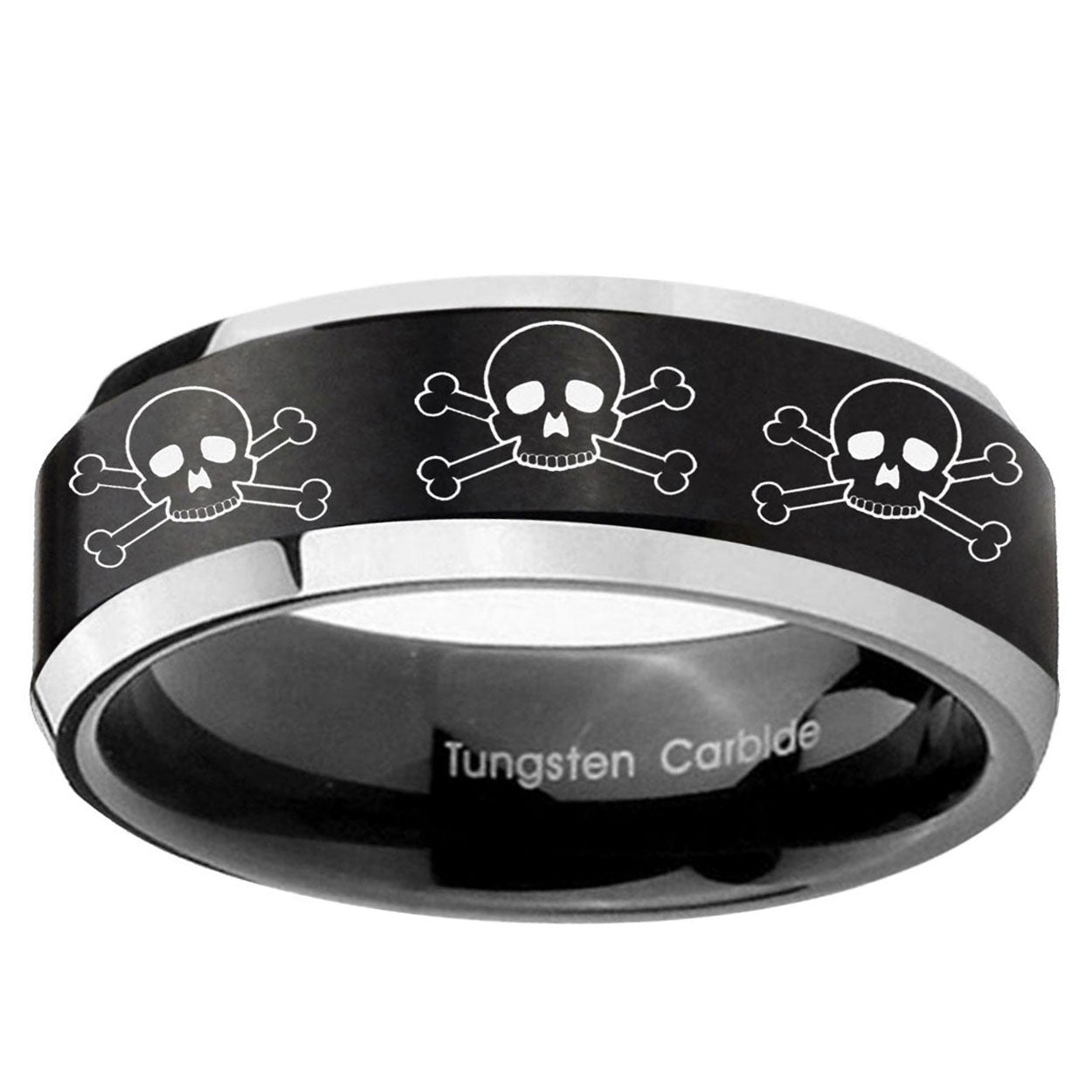 Style the 10mm Multiple Skull Beveled Edges Brush Black 2 Tone Tungsten Mens Bands Ring. This brushed black and 2-tone tungsten ring with Multiple Skull design is perfect for men.