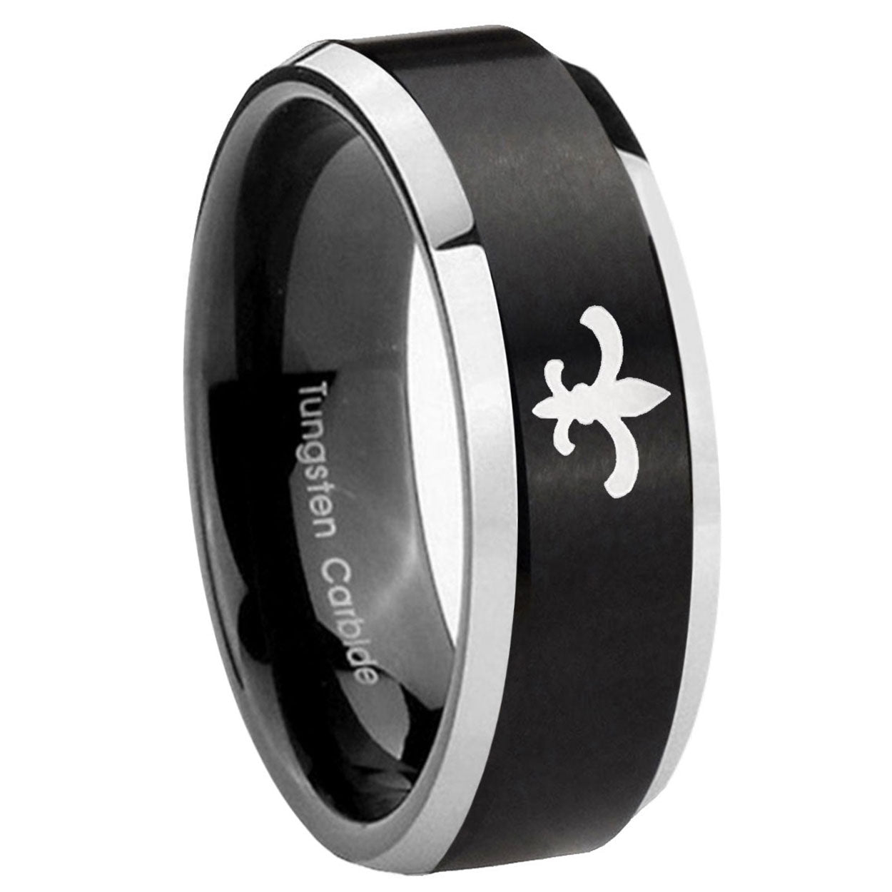 Style the 10mm Fleur-De-Lis Beveled Edges Brush Black 2 Tone Tungsten Rings for Men. This brushed black and 2-tone tungsten ring with Fleur-De-Lis design is perfect for men.