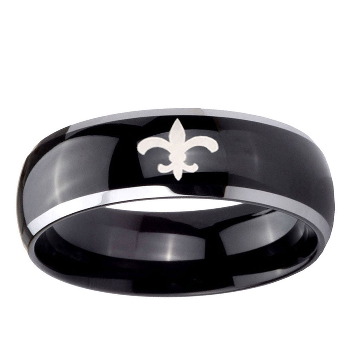 Intruding 5, 8mm Fleur-De-Lis Dome Glossy Black 2 Tone Tungsten Carbide Mens Wedding Ring . Offer in both 5mm and 8mm band width polished black plated two tone finished from size 4 to 14