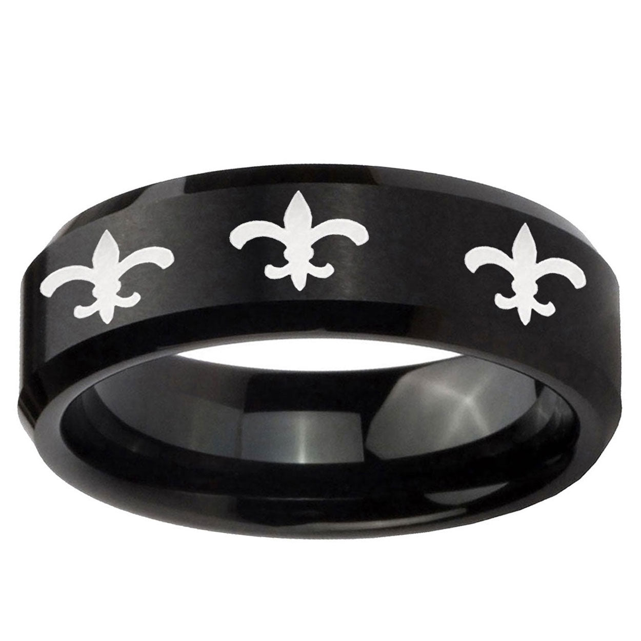 10mm Multiple Fleur-De-Lis Beveled Brush Black Tungsten Wedding Engagement Ring