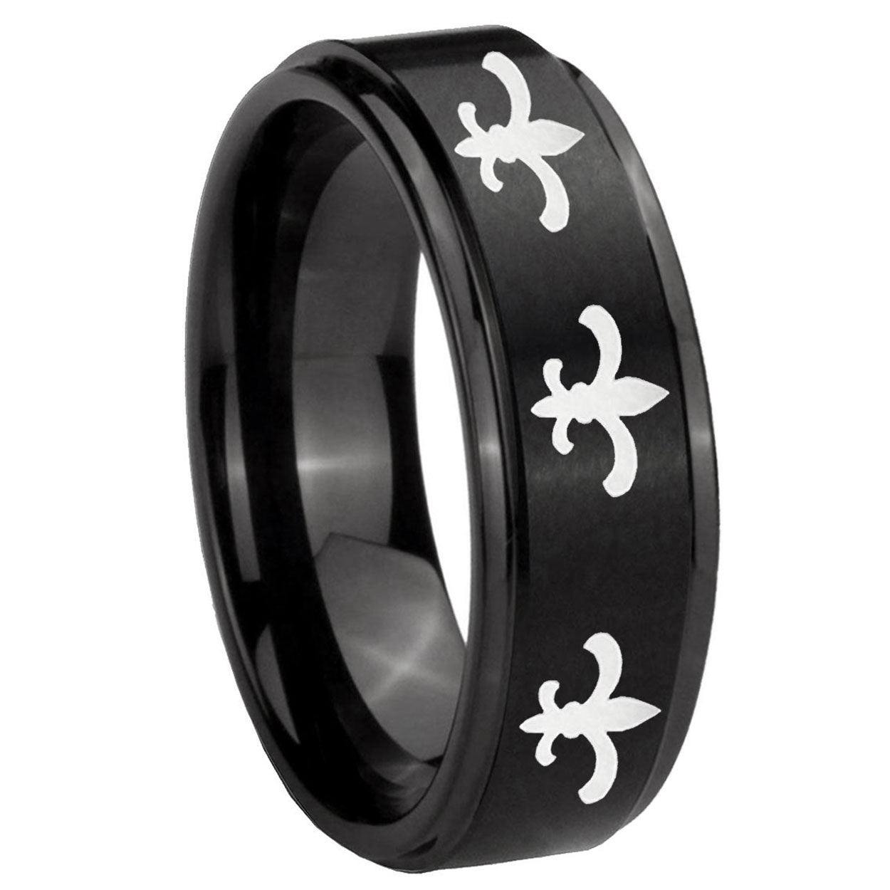 Celebrate with the 10mm Multiple Fleur-De-Lis Step Edges Brush Black Tungsten Wedding Band Mens. This brushed black ring with step edges and Multiple Fleur-De-Lis design is perfect for weddings.