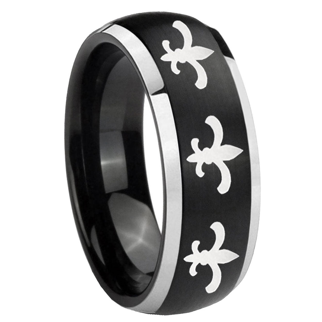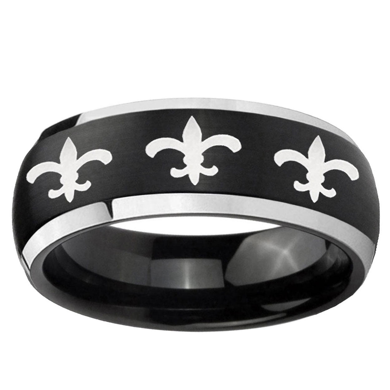 Intruding 5, 8mm Multiple Fleur-De-Lis Dome Brushed Black 2 Tone Tungsten Mens Wedding Ring . Offer in both 5mm and 8mm band width brushed black plated finished from size 4 to 14