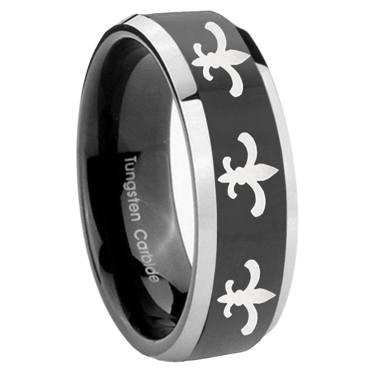 Style the 10mm Multiple Fleur-De-Lis Beveled Glossy Black 2 Tone Tungsten Men's Band Ring. This glossy black and 2-tone tungsten ring with Multiple Fleur-De-Lis design is perfect for men.