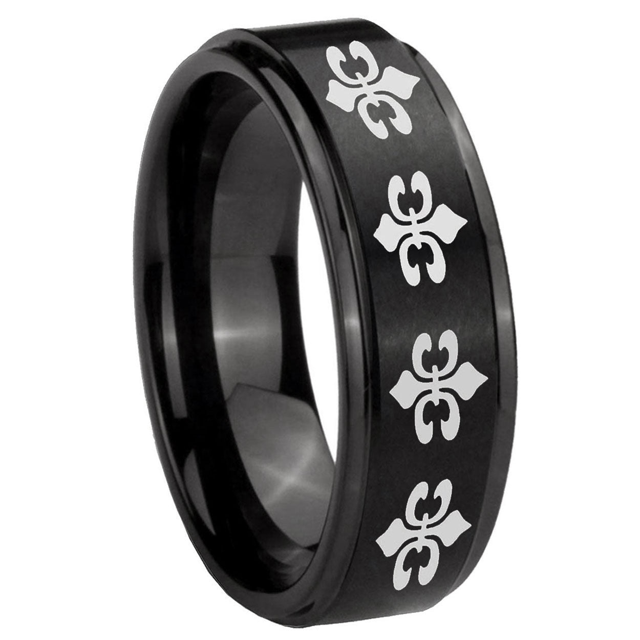 10mm Multiple Fleur-De-Lis Step Edges Brush Black Tungsten Men's Promise Rings