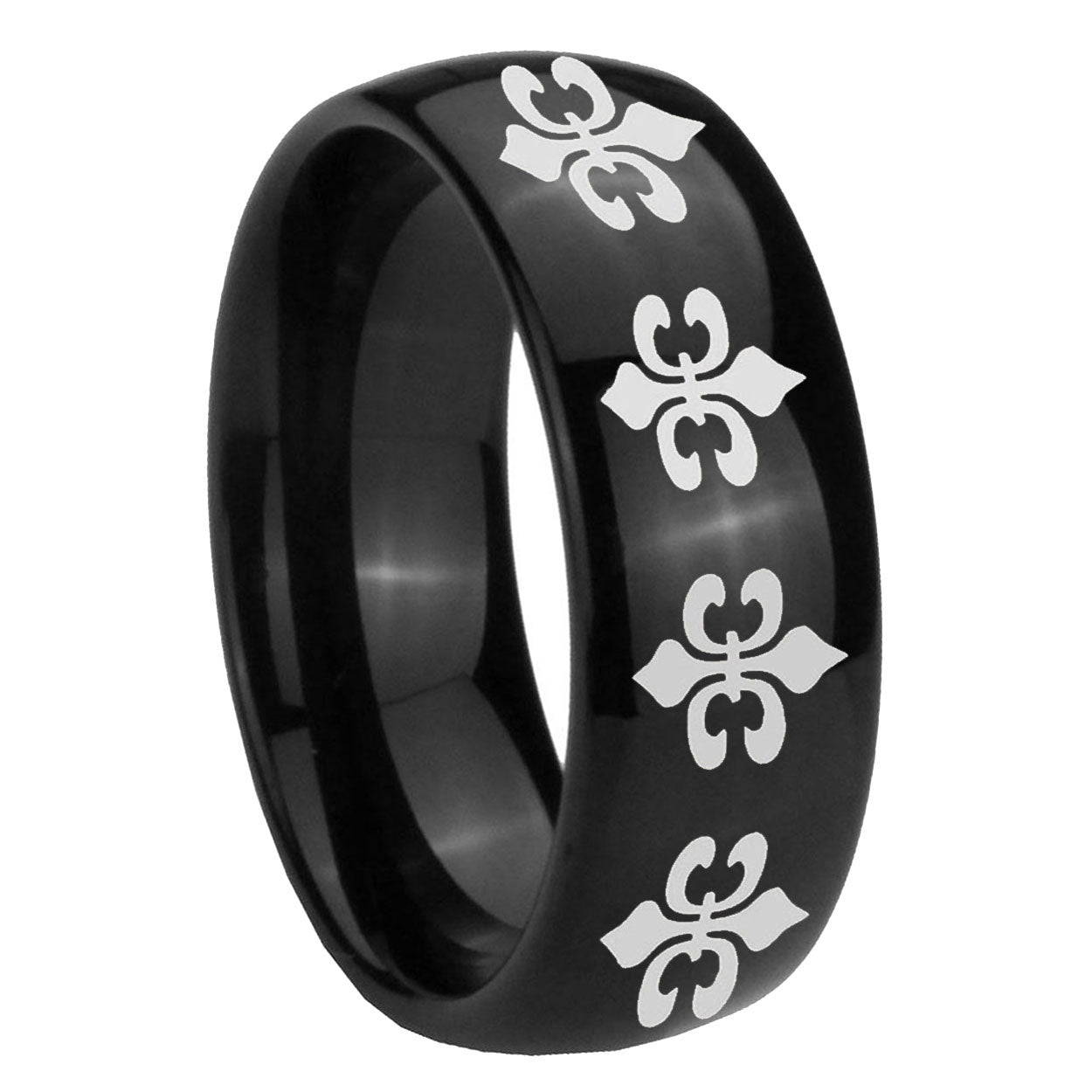 Intruding 5, 8mm Multiple Fleur-De-Lis Dome Black Tungsten Carbide Wedding Band Ring . Offer in both 5mm and 8mm band width polished black plated finished from size 4 to 14