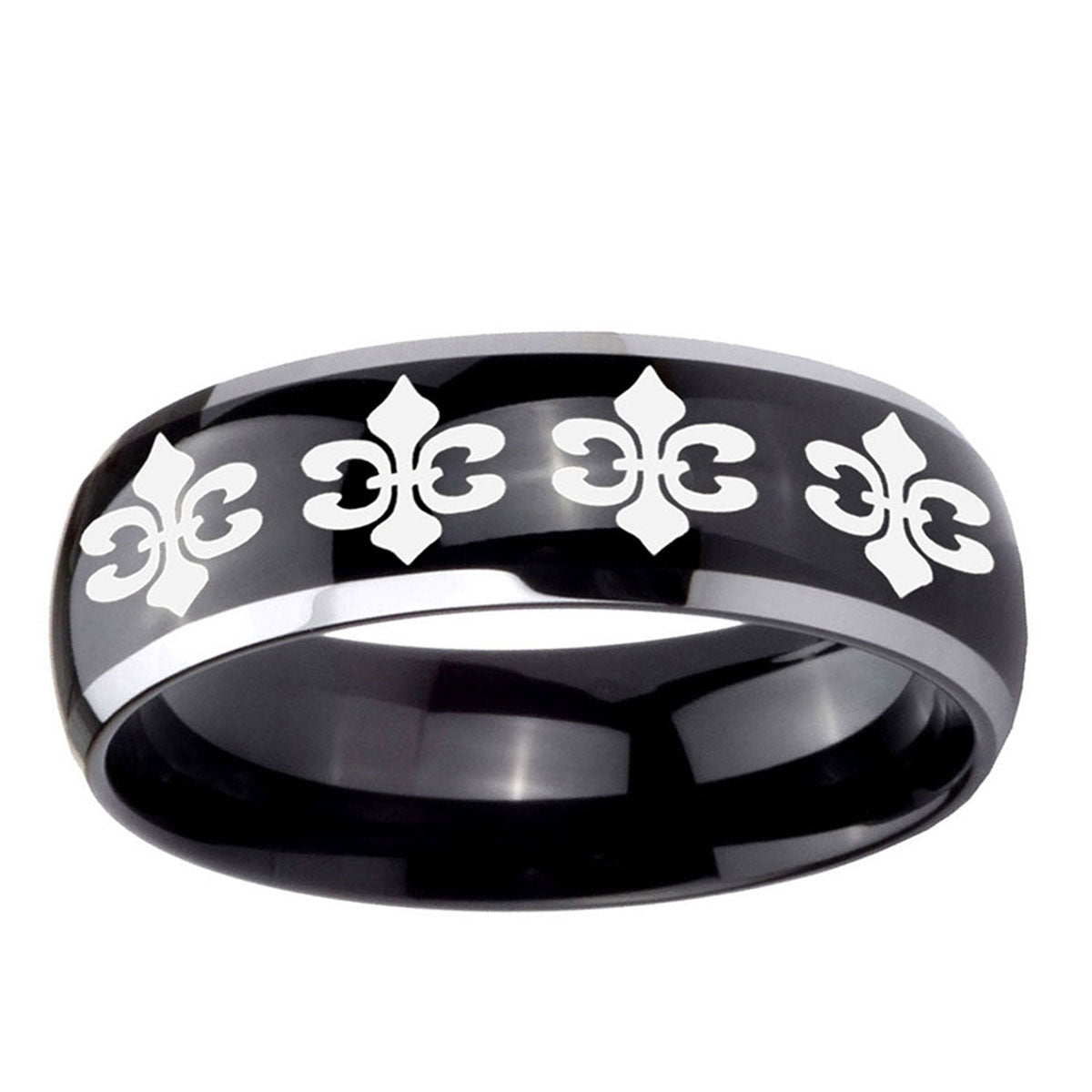 5, 8mm Multiple Fleur-De-Lis Dome Glossy Black 2 Tone Tungsten Engraved Ring