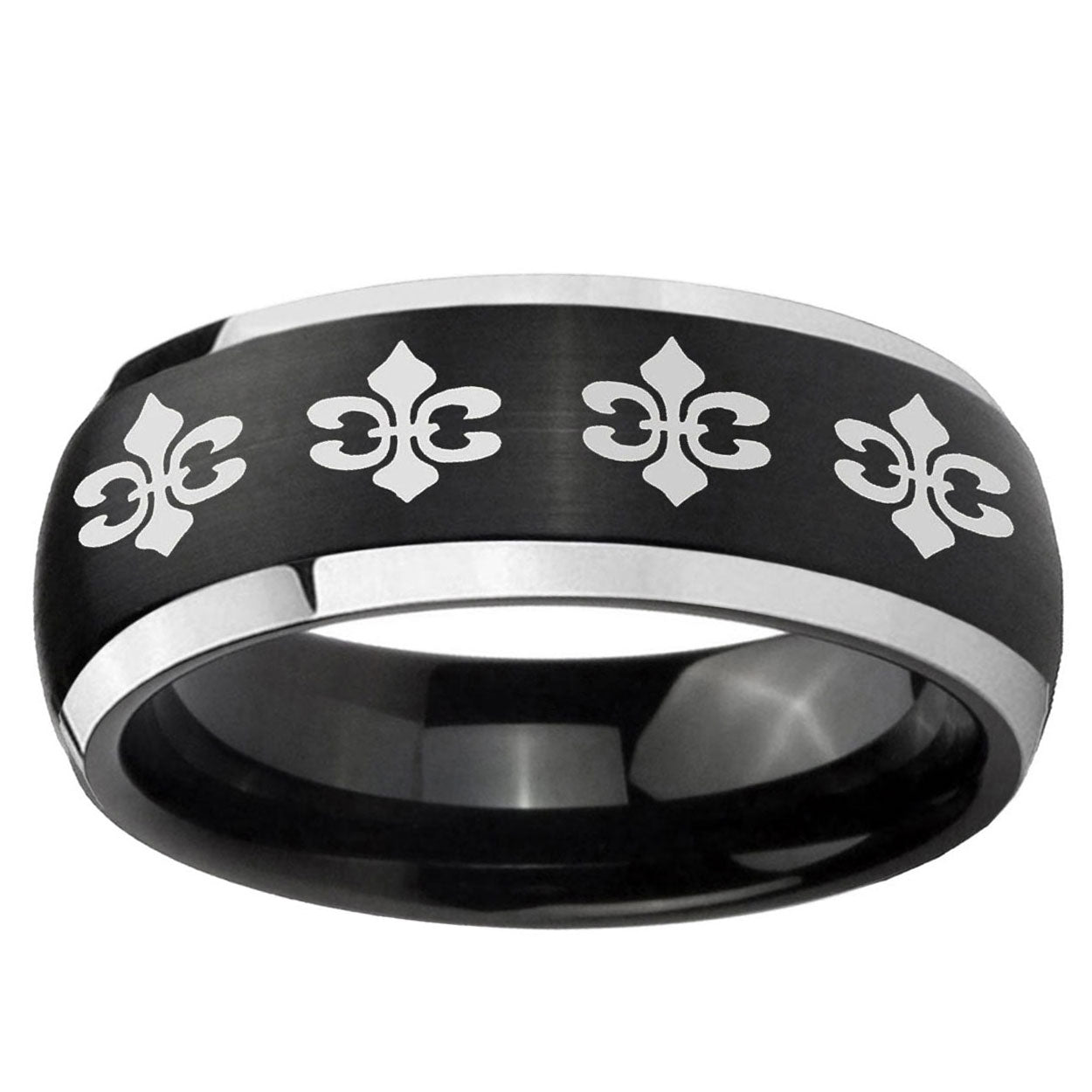 Intruding 5, 8mm Multiple Fleur-De-Lis Dome Brushed Black 2 Tone Tungsten Custom Mens Ring . Offer in both 5mm and 8mm band width brushed black plated finished from size 4 to 14