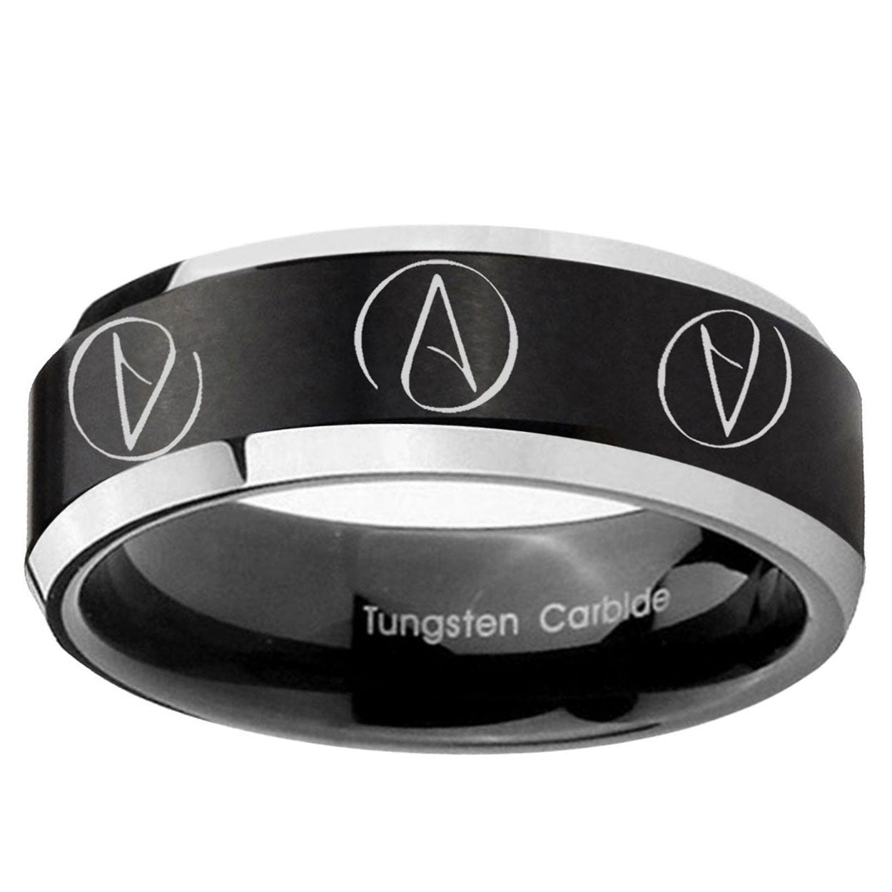 Intruding 5, 8mm Atheist Design Beveled Brush Black 2 Tone Tungsten Men's Ring . Offer in both 5mm and 8mm band width brushed black plated 2 tone finished from size 4 to 14