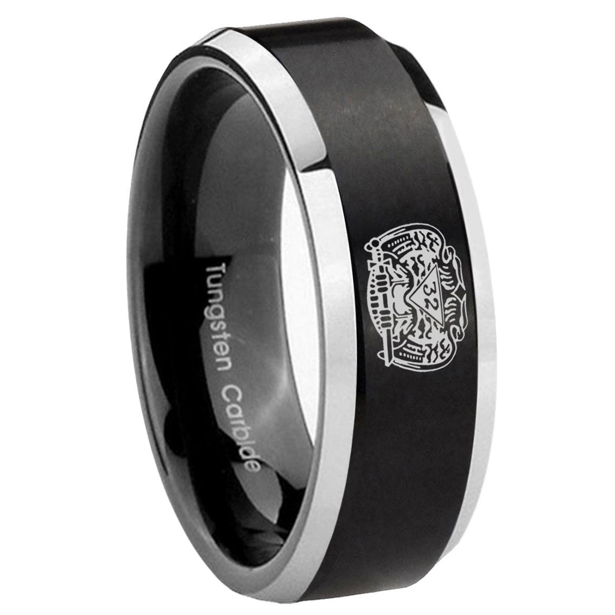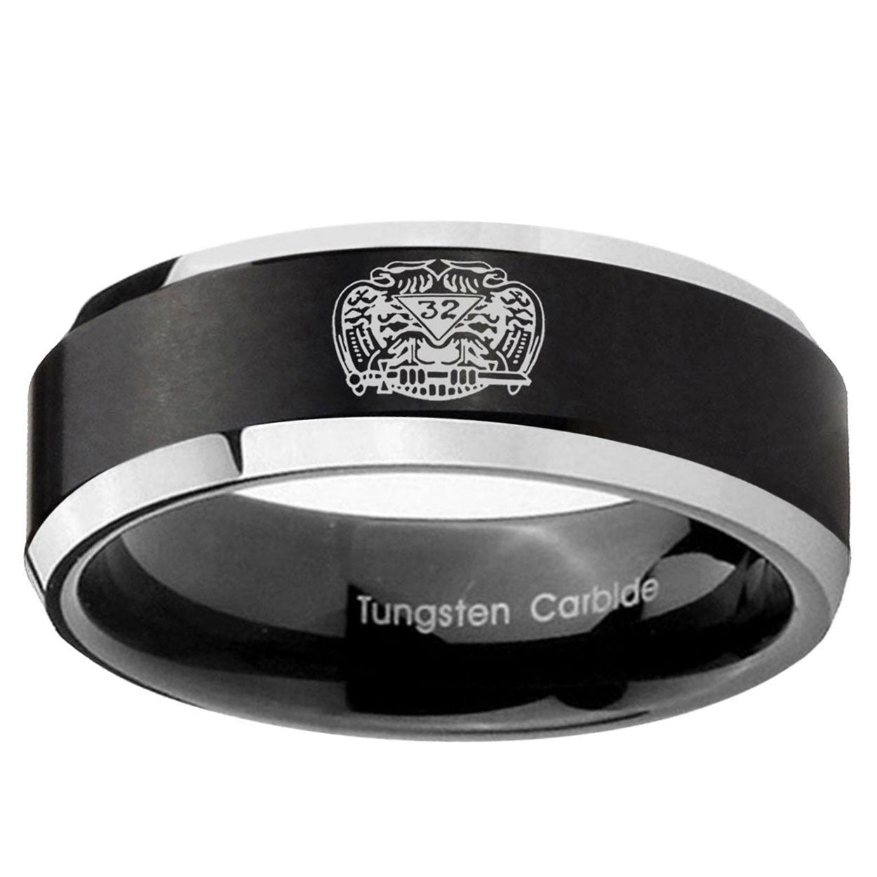 Intruding 5, 8mm Masonic 32 Degree Freemason Beveled Edges Brush Black 2 Tone Tungsten Carbide Men's Bands Ring . Offer in both 5mm and 8mm band width brushed black plated 2 tone finished from size 4 to 14