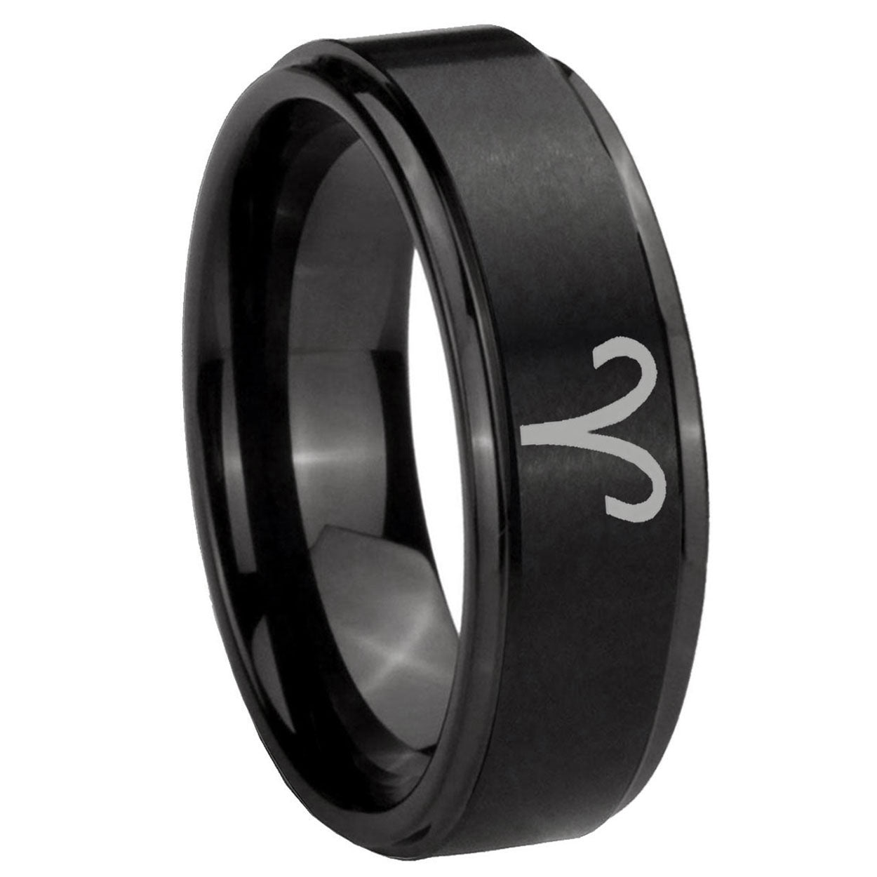 Intruding 5, 8mm Aries Zodiac Step Edges Brush Black Tungsten Carbide Wedding Band Ring . Offer in both 5mm and 8mm band width brush black plated finished from size 4 to 14