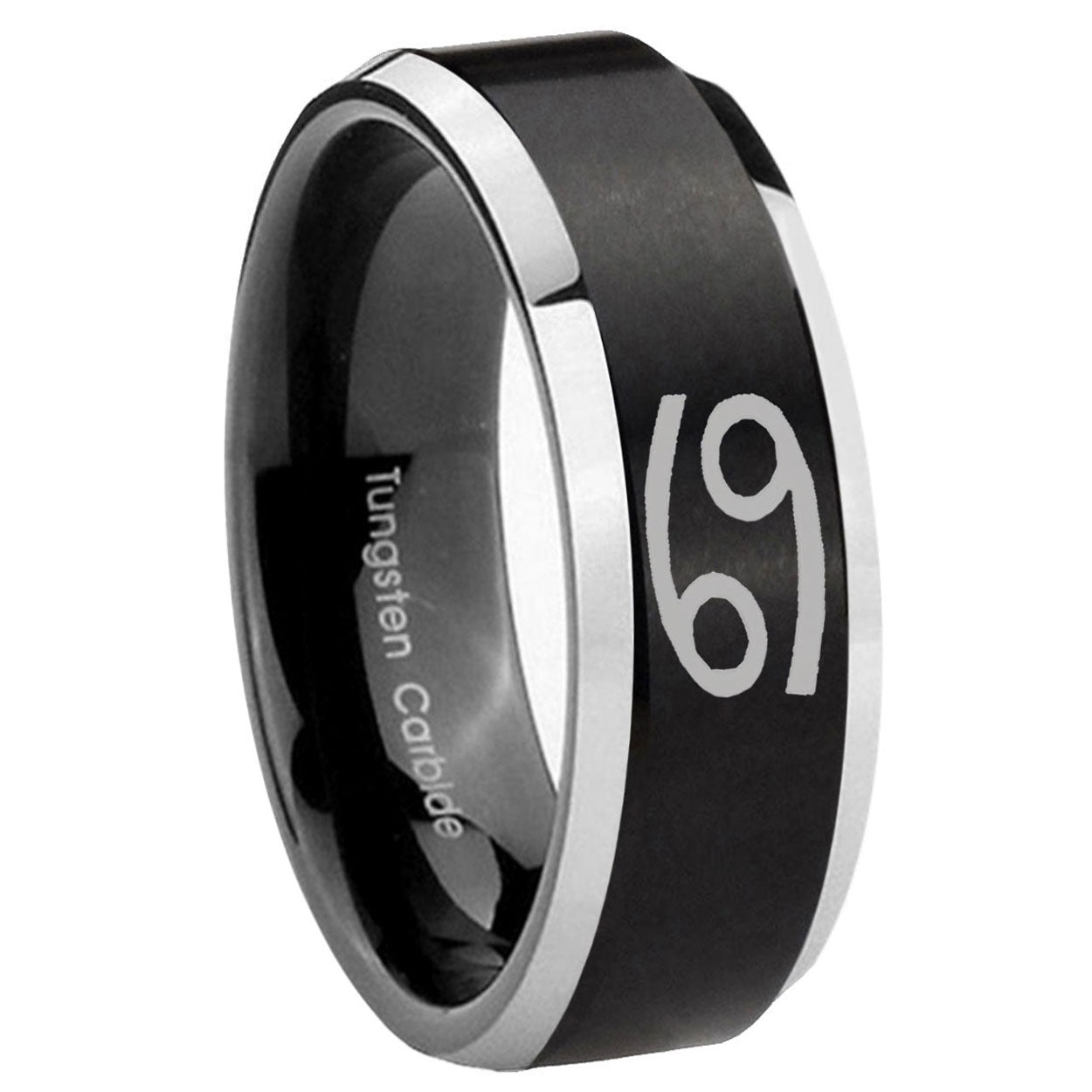 Embrace your sign with the 10mm Cancer Horoscope Beveled Brush Black 2 Tone Tungsten Wedding Band Mens. This brushed black and 2-tone tungsten ring with Cancer design is perfect for weddings.