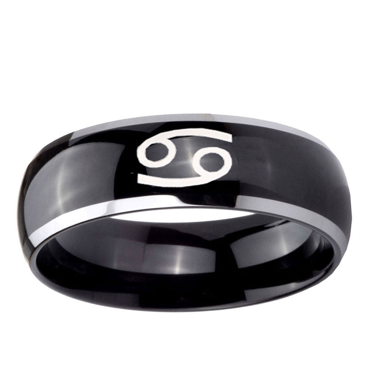 Intruding 5, 8mm Cancer Horoscope Dome Glossy Black 2 Tone Tungsten Carbide Promise Ring . Offer in both 5mm and 8mm band width polished black plated two tone finished from size 4 to 14