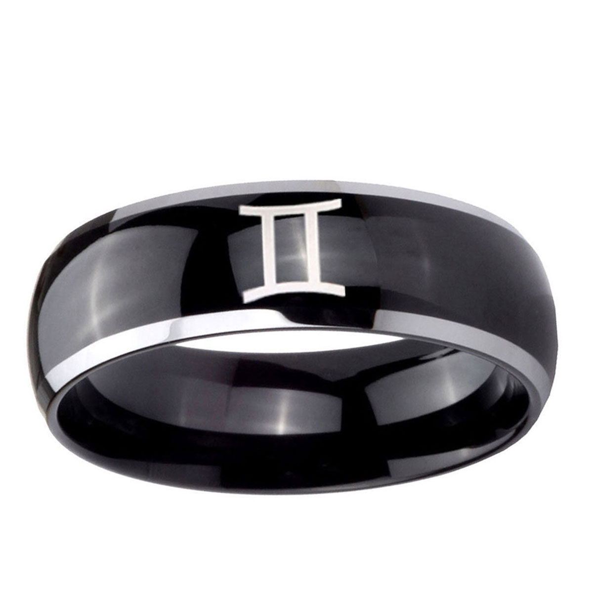 Propose with the 10mm Gemini Zodiac Dome Glossy Black 2 Tone Tungsten Mens Engagement Band. This glossy black and 2-tone dome ring with Gemini Zodiac design is ideal for engagements.