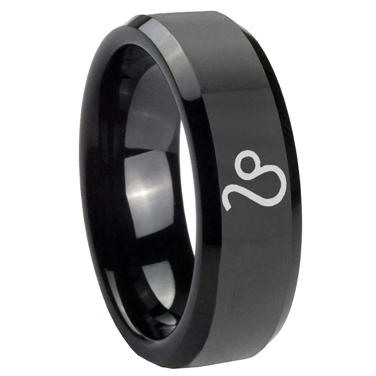 Intruding 5, 8mm Leo Zodiac Beveled Edges Black Tungsten Carbide Mens Bands Ring . Offer in both 5mm and 8mm band width polished black plated finished from size 4 to 14