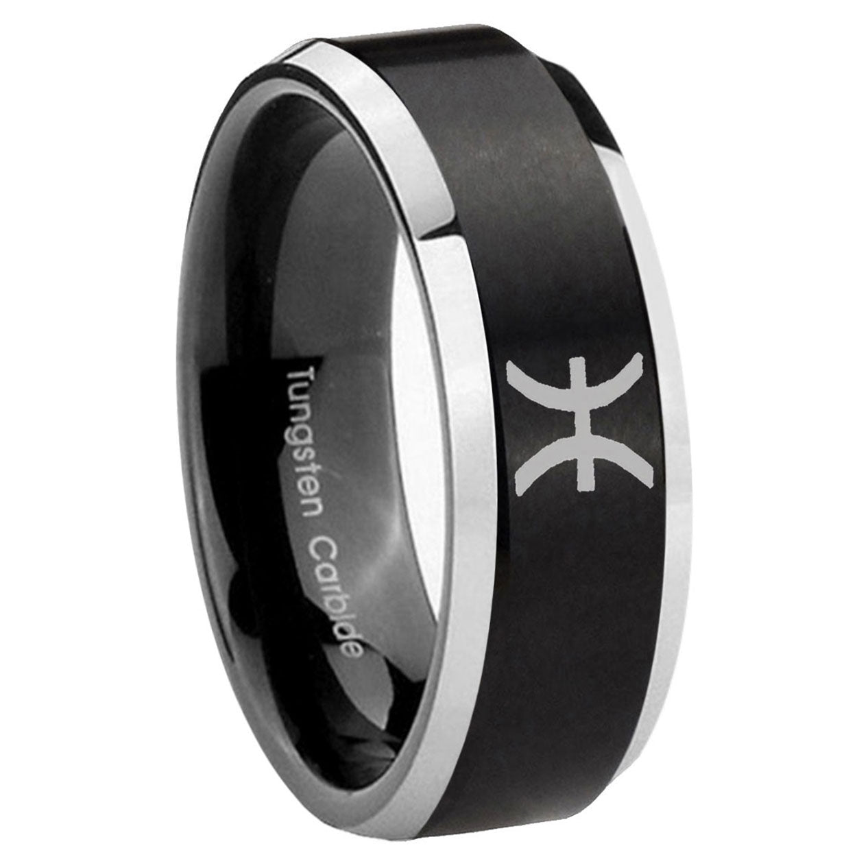 Intruding 5, 8mm Pisces Zodiac Beveled Edges Brush Black 2 Tone Tungsten Mens Bands Ring . Offer in both 5mm and 8mm band width brushed black plated 2 tone finished from size 4 to 14