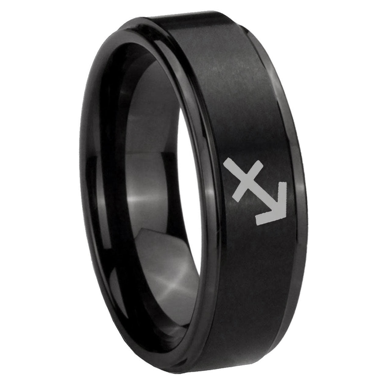 Propose with the 10mm Sagittarius Zodiac Step Edges Brush Black Tungsten Men's Engagement Band. This brushed black ring with step edges and Sagittarius Zodiac design is ideal for engagements.