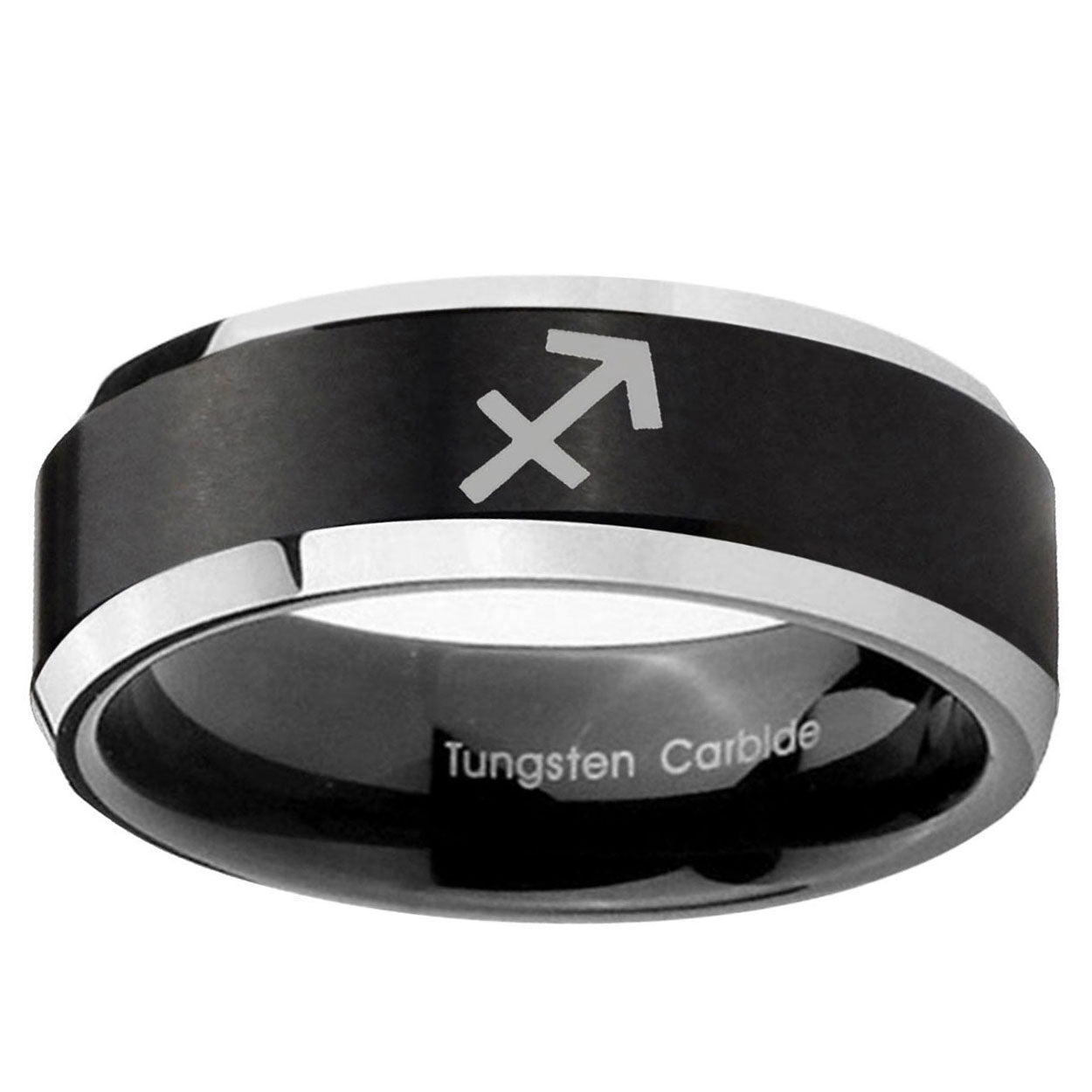 Intruding 5, 8mm Sagittarius Zodiac Beveled Brush Black 2 Tone Tungsten Men's Bands Ring . Offer in both 5mm and 8mm band width brushed black plated 2 tone finished from size 4 to 14