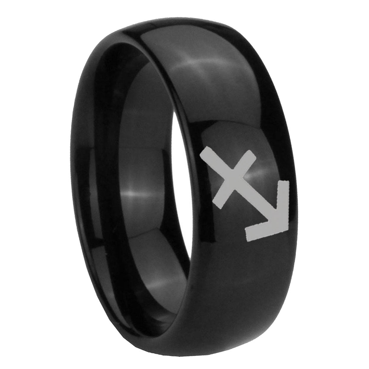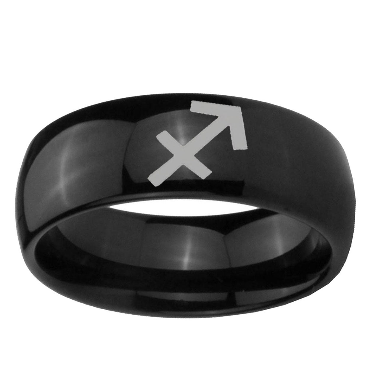 Intruding 5, 8mm Sagittarius Zodiac Dome Black Tungsten Carbide Men's Band Ring . Offer in both 5mm and 8mm band width polished black plated finished from size 4 to 14