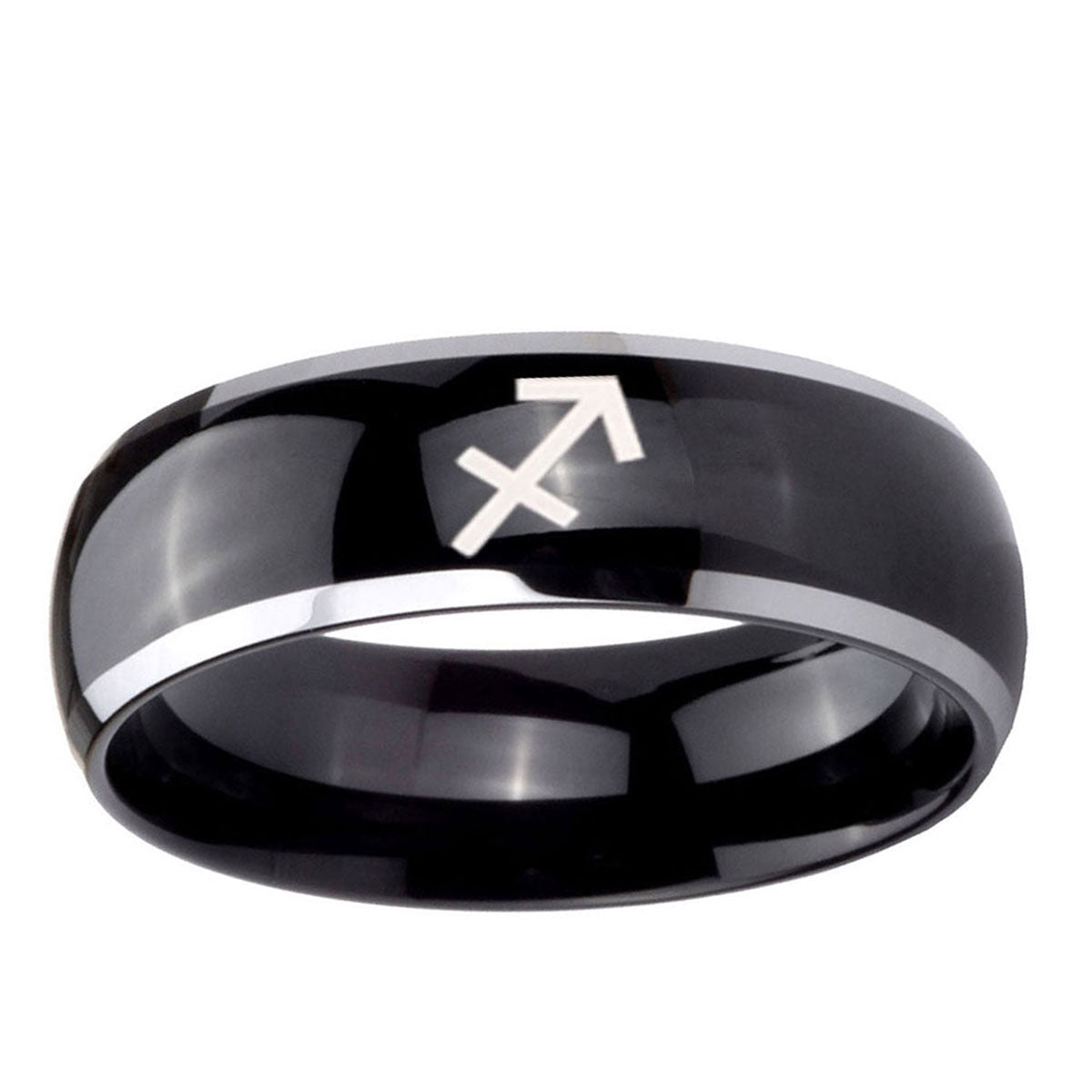 Intruding 5, 8mm Sagittarius Zodiac Dome Glossy Black 2 Tone Tungsten Wedding Engraving Ring . Offer in both 5mm and 8mm band width polished black plated two tone finished from size 4 to 14
