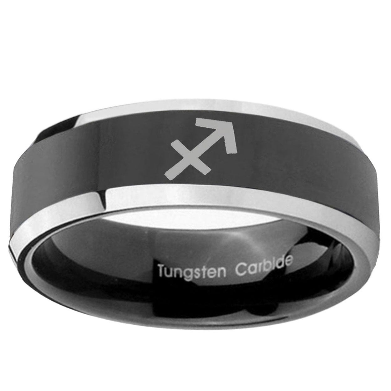 Customize the 10mm Sagittarius Zodiac Beveled Glossy Black 2 Tone Tungsten Custom Ring for Men. This glossy black and 2-tone tungsten ring with Sagittarius Zodiac design is perfect for personalization.