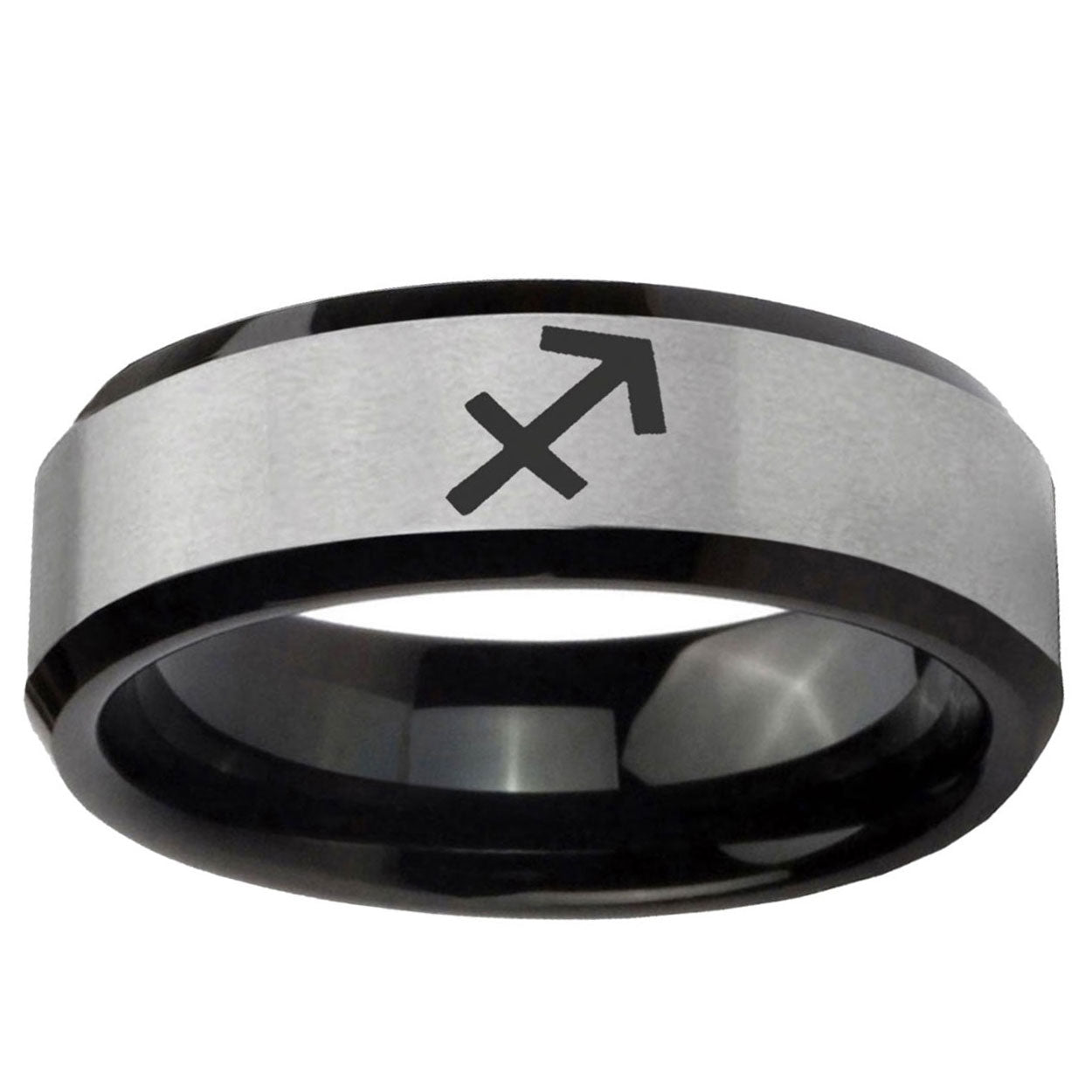Intruding 5, 8mm Sagittarius Zodiac Beveled Brush Black 2 Tone Tungsten Personalized Ring . Offer in both 5mm and 8mm band width brush black 2 tone finished from size 4 to 14