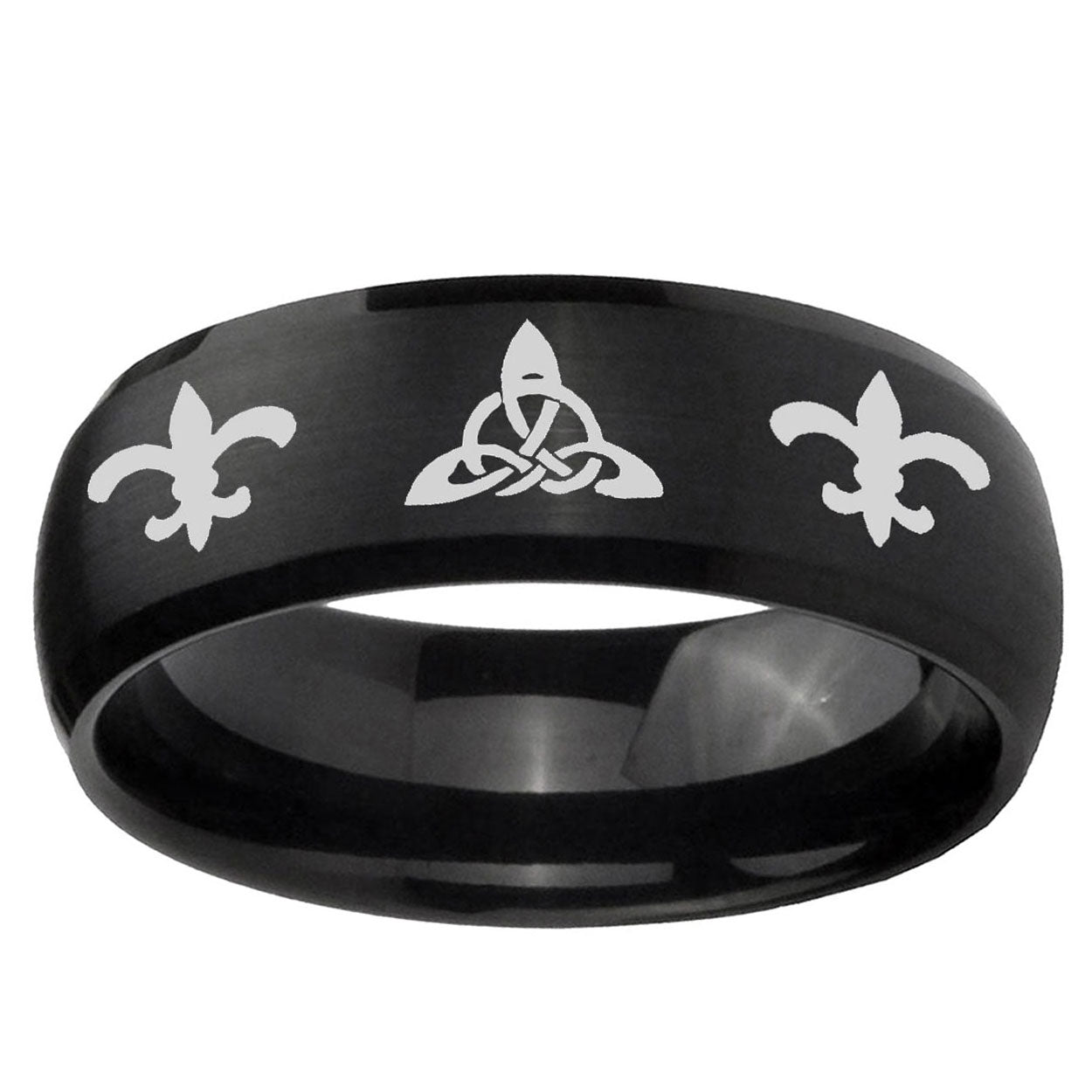 Celebrate with the 10mm Celtic Triangle Fleur-De-Lis Dome Brush Black Tungsten Wedding Band Ring. This brushed black dome ring with Celtic triangle Fleur-De-Lis design is perfect for weddings.