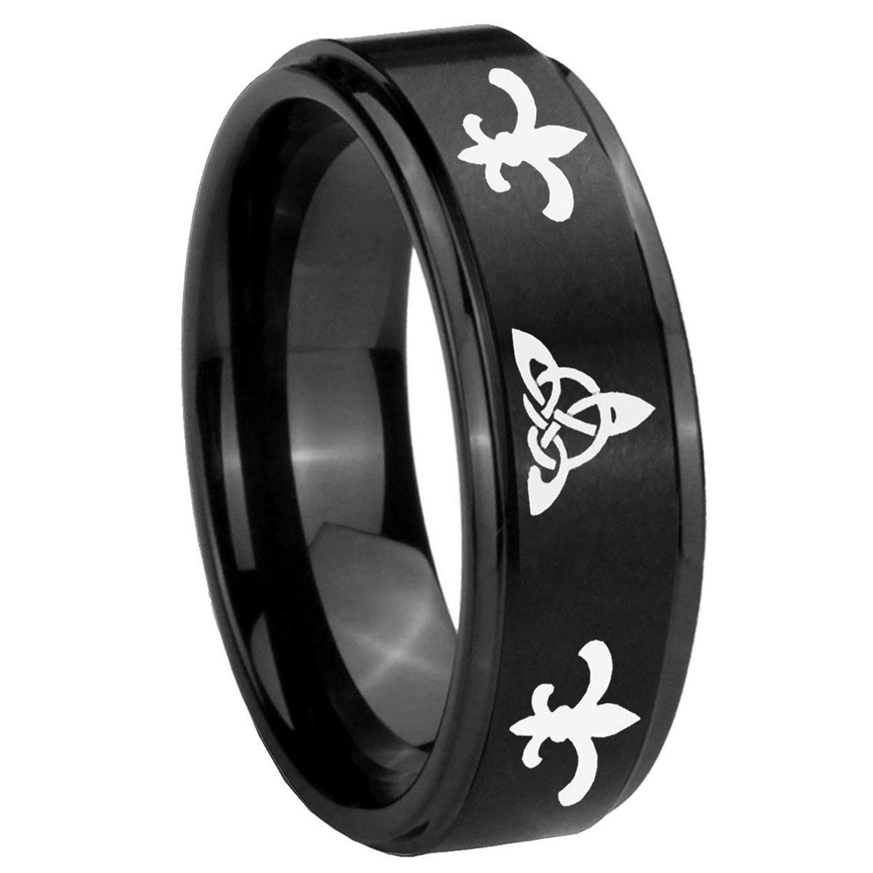 Intruding 5, 8mm Celtic Triangle Fleur-De-Lis Step Edges Brush Black Tungsten Promise Ring . Offer in both 5mm and 8mm band width brush black plated finished from size 4 to 14