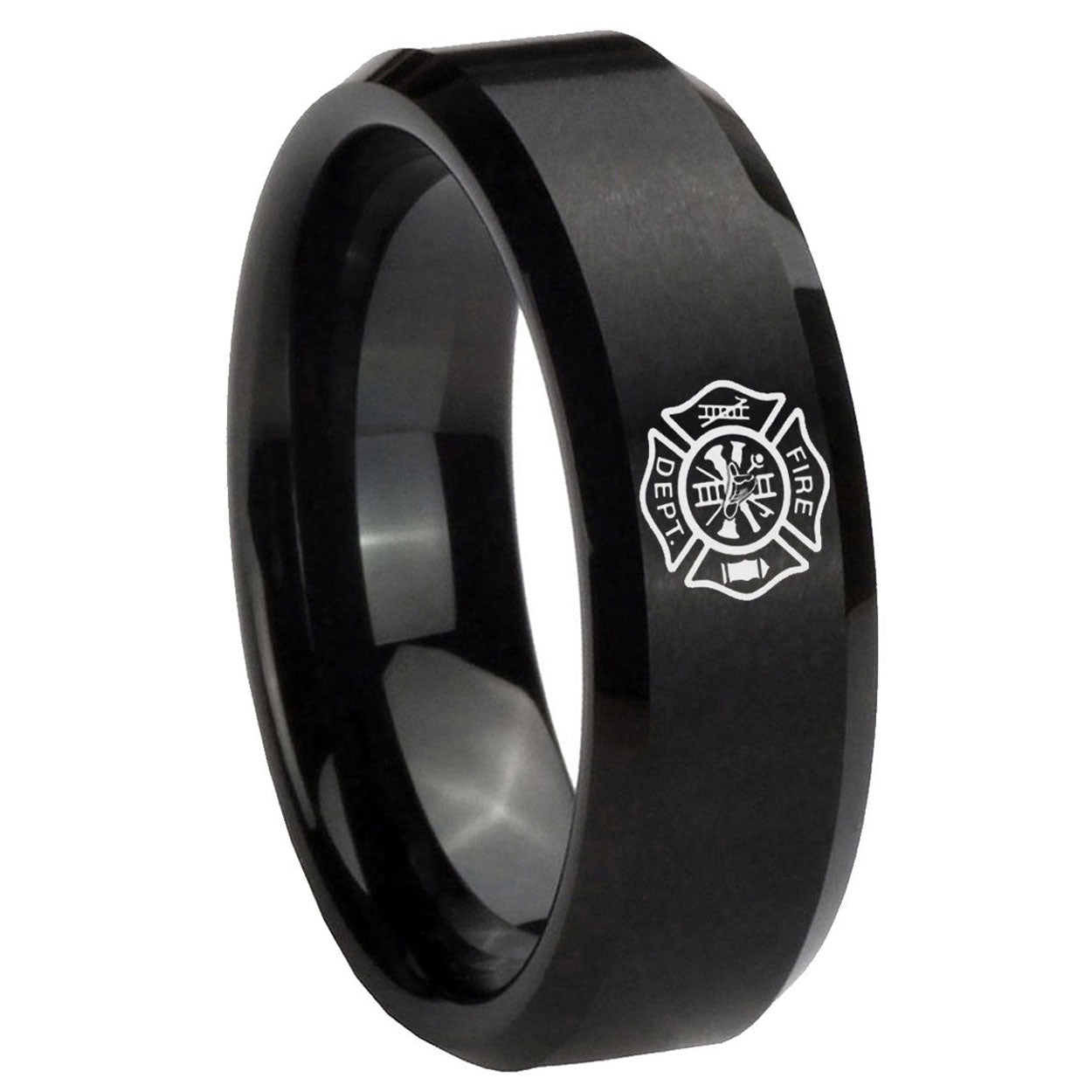 Celebrate with the 10mm Fire Department Beveled Edges Brush Black Tungsten Wedding Band Ring. This brushed black tungsten ring with Fire Department design is perfect for weddings.