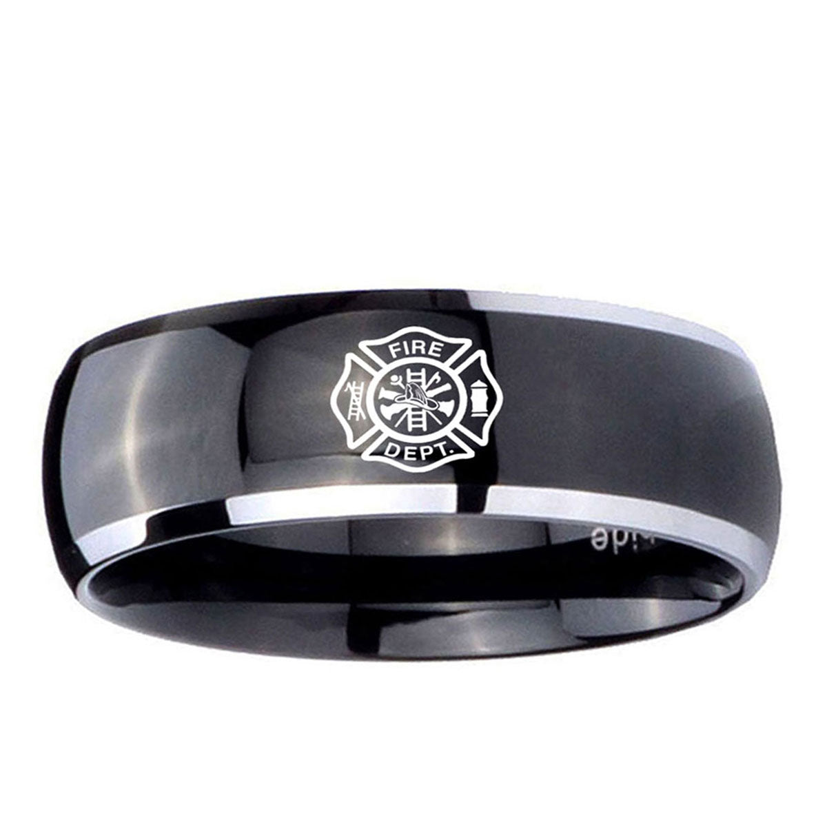 Intruding 5, 8mm Fire Department Dome Glossy Black 2 Tone Tungsten Carbide Custom Mens Ring . Offer in both 5mm and 8mm band width polished black plated two tone finished from size 4 to 14