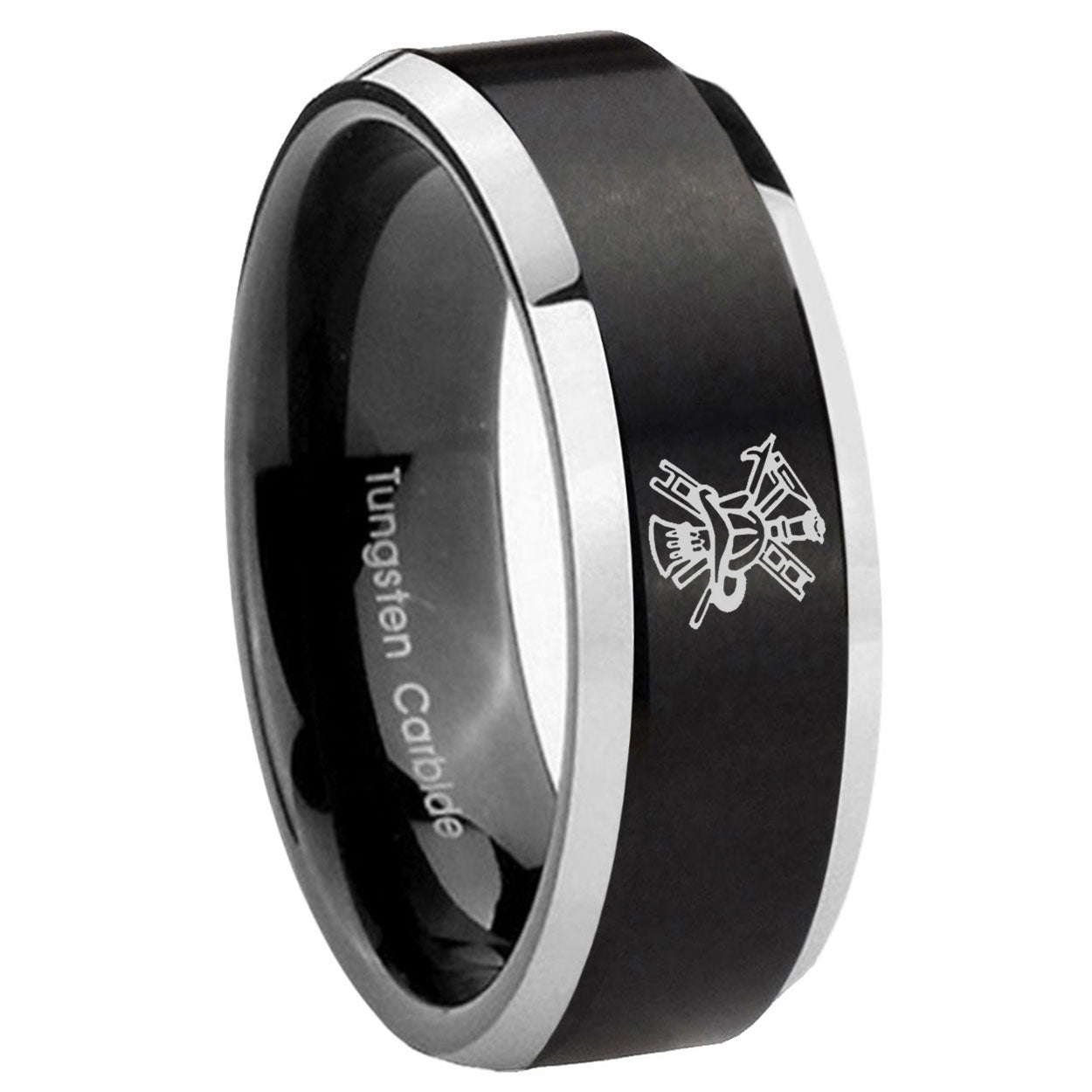 Celebrate with the 10mm Fireman Beveled Edges Brush Black 2 Tone Tungsten Wedding Band Ring. This brushed black and 2-tone tungsten ring with Fireman design is perfect for weddings.
