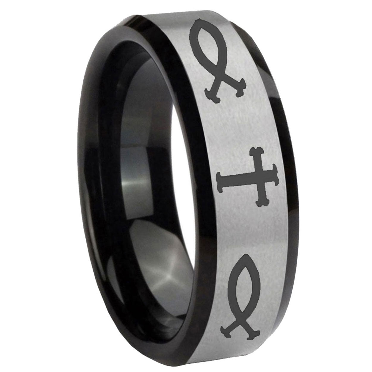Celebrate with the 10mm Fish & Cross Beveled Brushed Silver Black Tungsten Men's Wedding Ring. This silver and black tungsten ring with Fish & Cross design is perfect for weddings.
