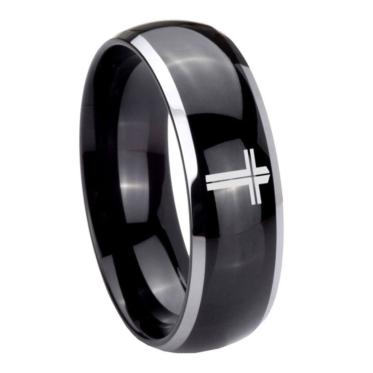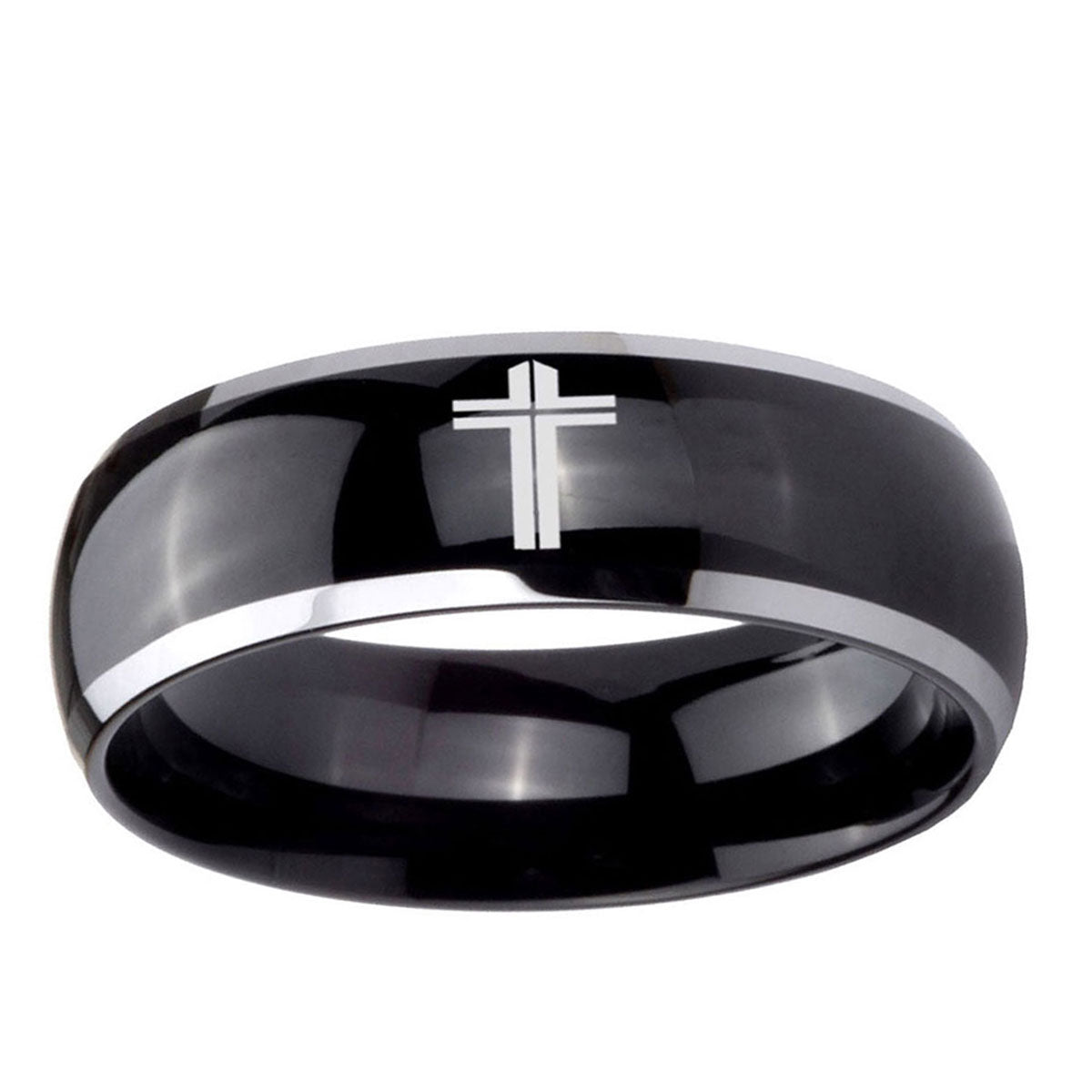 Intruding 5, 8mm Flat Christian Cross Dome Glossy Black 2 Tone Tungsten Wedding Band Ring . Offer in both 5mm and 8mm band width polished black plated two tone finished from size 4 to 14