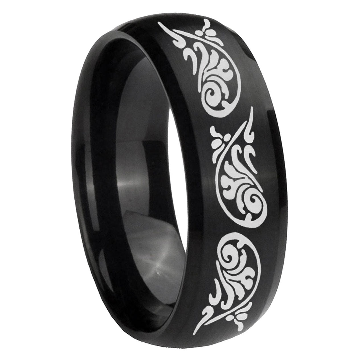 Intruding 5, 8mm Etched Tribal Pattern Dome Brush Black Tungsten Carbide Wedding Bands Ring . Offer in both 5mm and 8mm band width brush black plated finished from size 4 to 14
