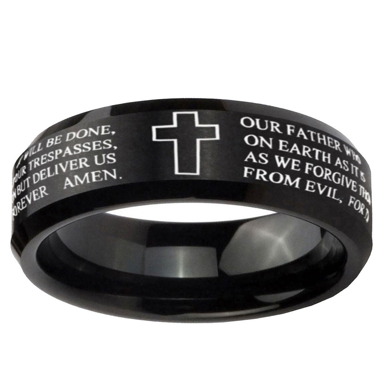 Propose with the 10mm Bible Lord's Prayer Cross Beveled Edges Brush Black Tungsten Men's Engagement Ring. This brushed black tungsten ring with cross and Lord's Prayer design is perfect for engagements.