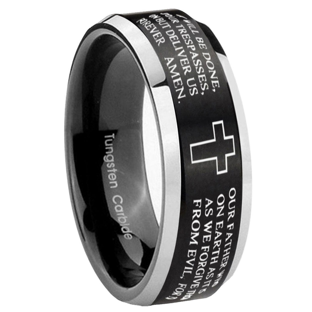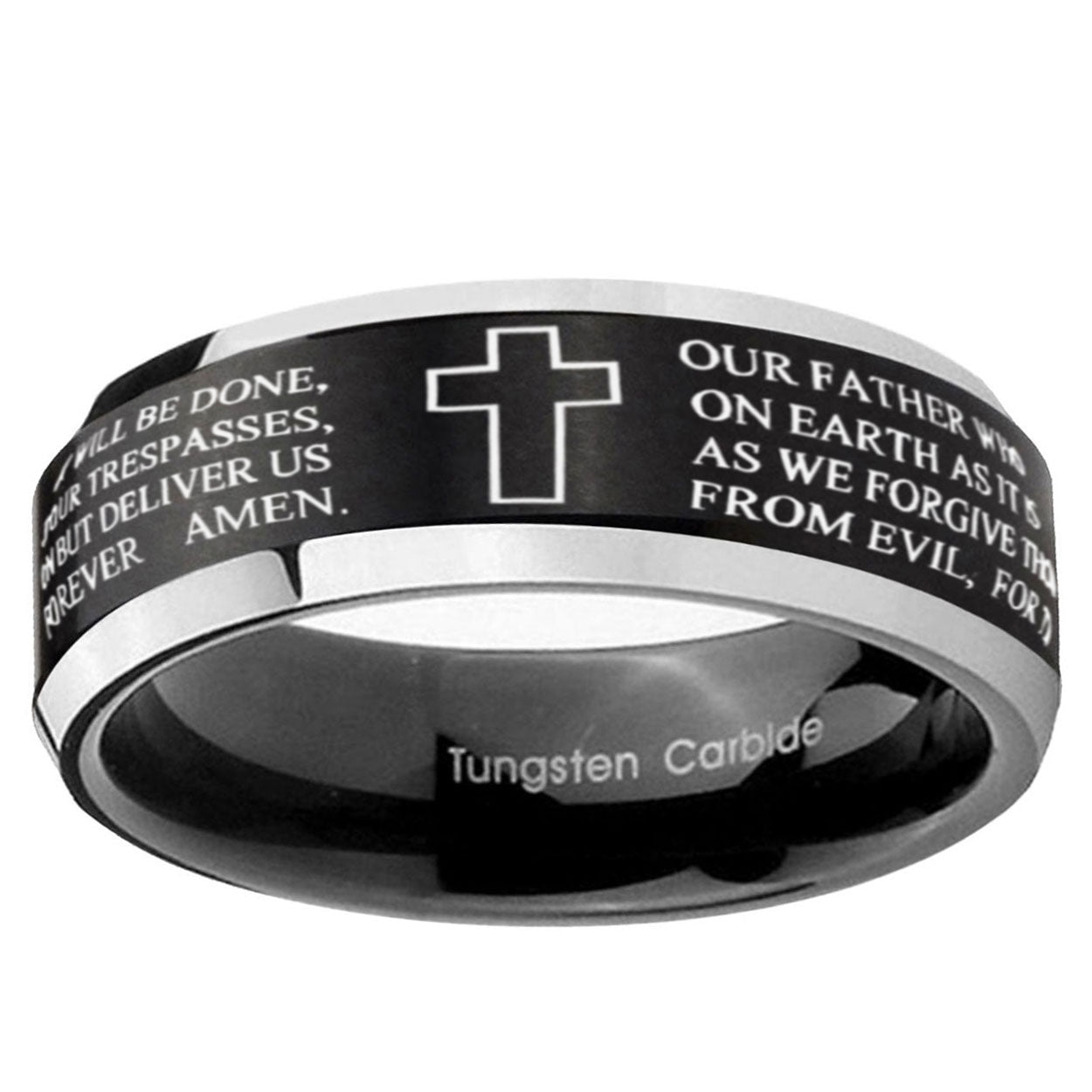 Intruding 5, 8mm Etched Lord's Prayer Cross Beveled Edges Brush Black 2 Tone Tungsten Mens Bands Ring . Offer in both 5mm and 8mm band width brushed black plated 2 tone finished from size 4 to 14